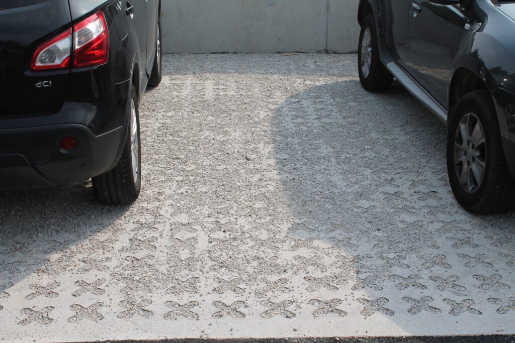 Ce système breveté comprend un pavage cellulaire en béton renforcé composé de moules alvéolés enduits d’un revêtement antistatique qui empêche l’adhérence du béton, créant ainsi des vides. Ces cavités sont comblées avec de la terre avant l’implantation d’une couverture végétale.
