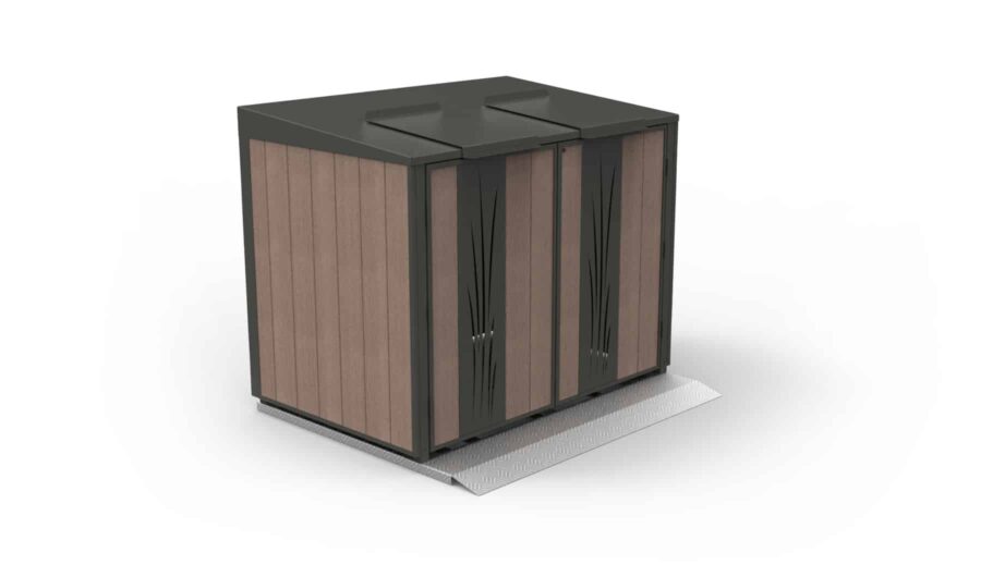 L’abri conteneurs Composit est un abri en bois qui ne demande aucun entretien ! Le bois composit est un matériau composé de fibres de bois et de plastique. Recyclable, il ne se grise pas et est imputrescible. Si besoin, il est installé sur une base de lestage.