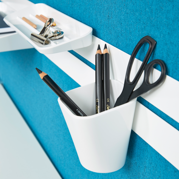 Un support magnétique peut être ajouté à la façade de l’écran pour fixer un porte-stylo et des accessoires d’étagère de différentes tailles, tous spécialement conçus pour Domo by Borselius.