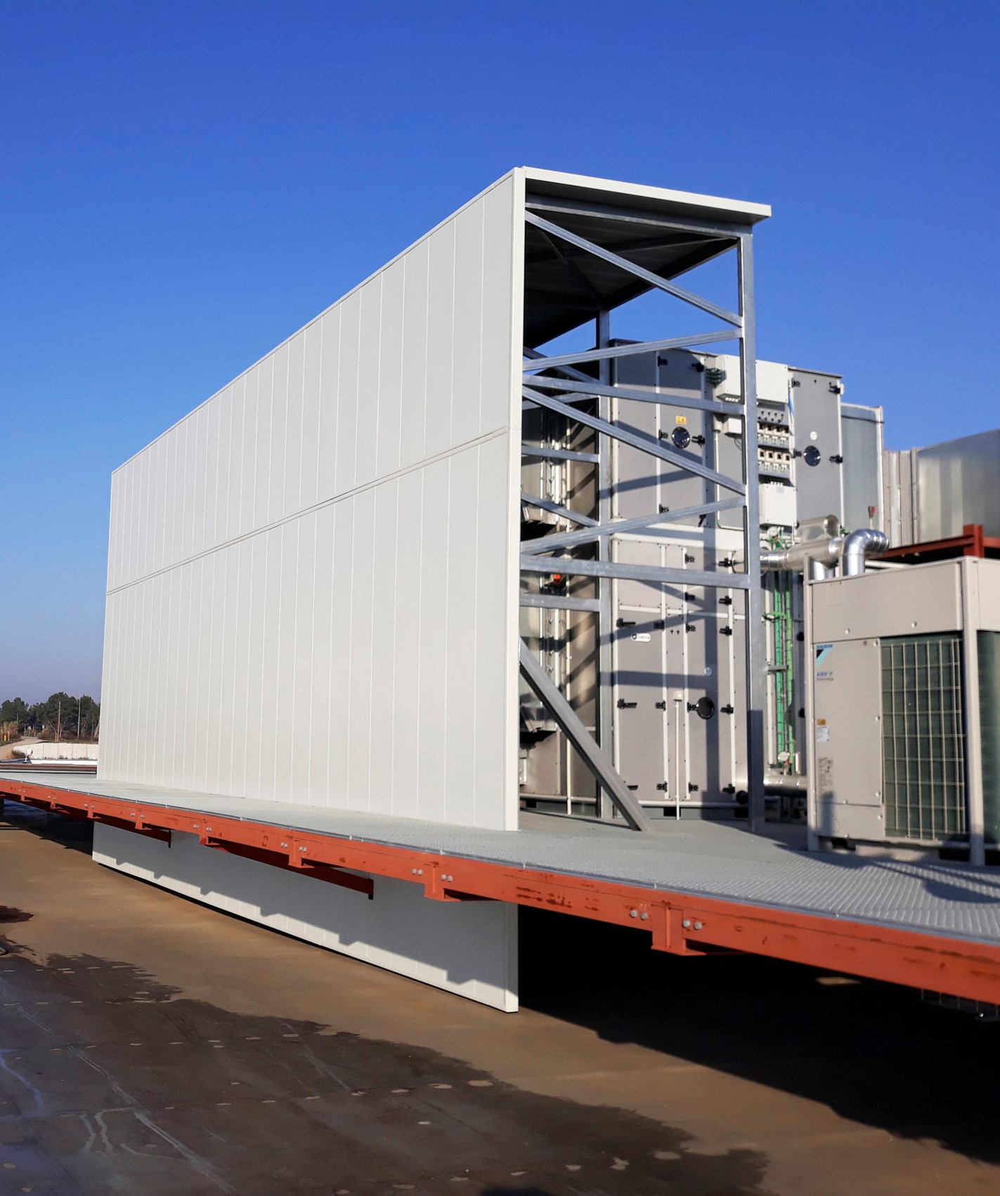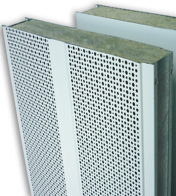 Panneau modulaire avec remplissage intérieur en laine de roche haute densité, tôle prélaquée pleine sur face extérieure et perforée côté intérieur.