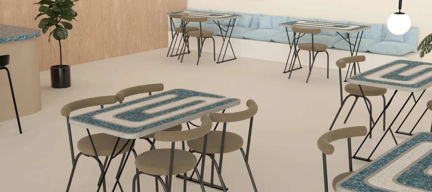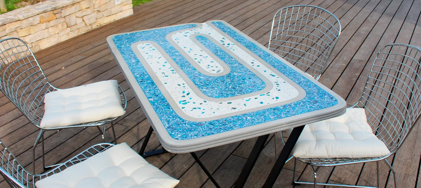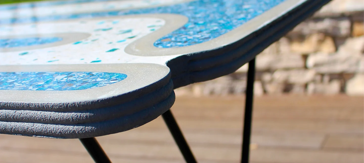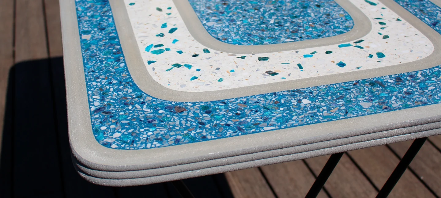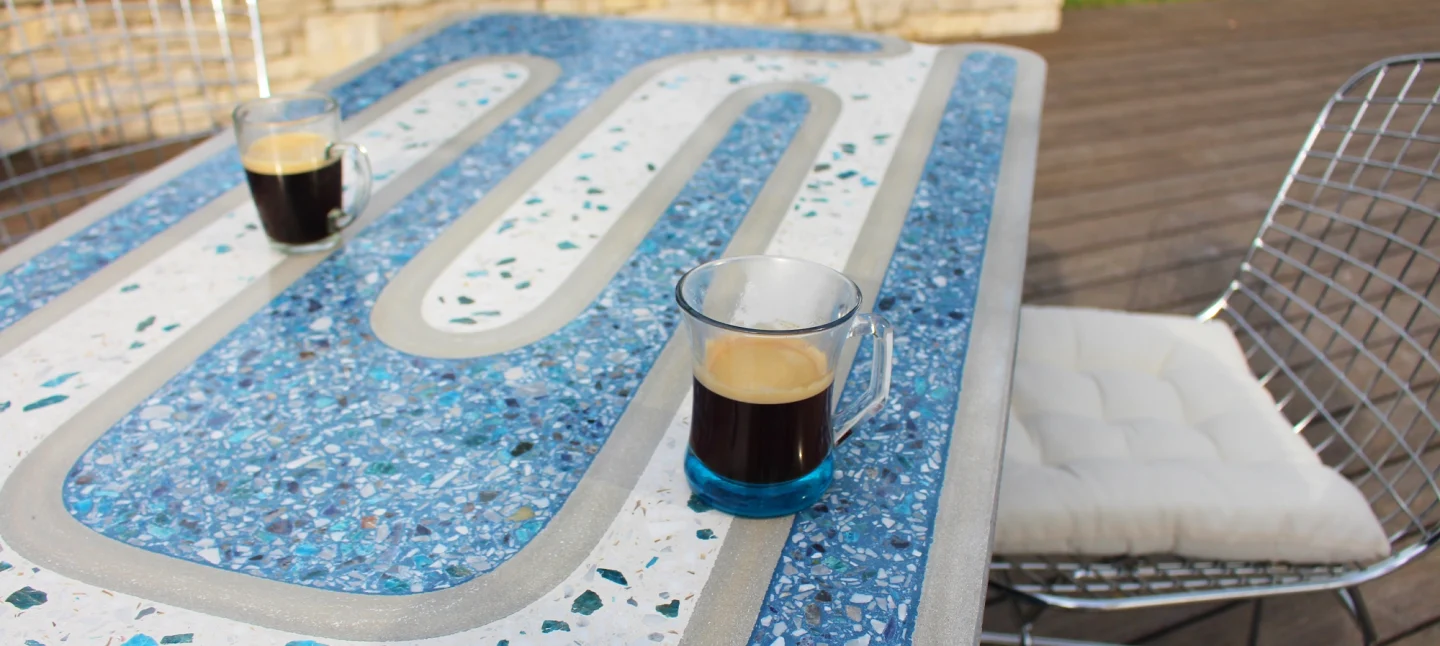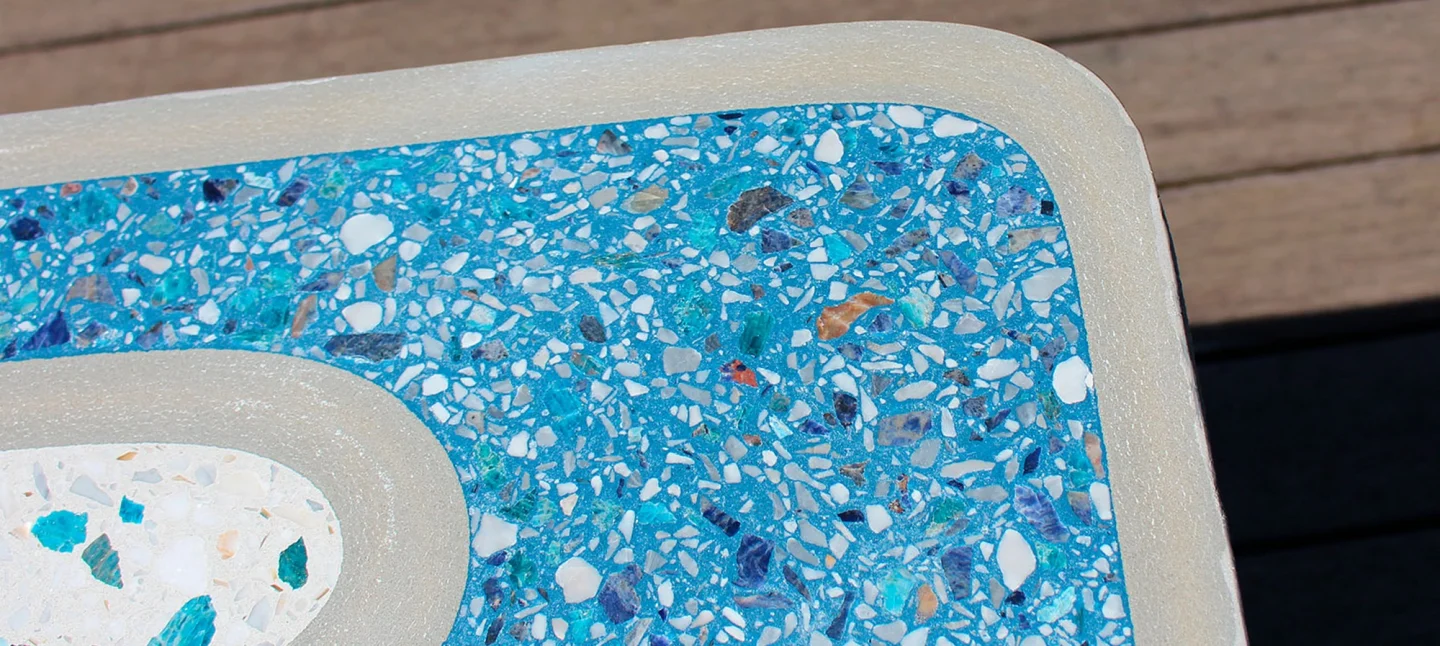 Avec son design unique la Table Bistrot® sublime le terrazzo en l’entremêlant harmonieusement au béton, révélant ainsi des motifs élégants.