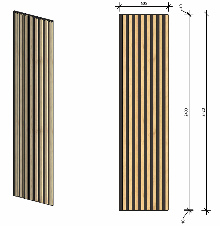 Le produit Façon Lattis - Panneaux muraux et plafond sur PET | LE COMPLEXE du fabicant CTI OUEST a une épaisseur de 32 ou 52 mm, une longueur de 2420 mm, une largeur de 605 mm,