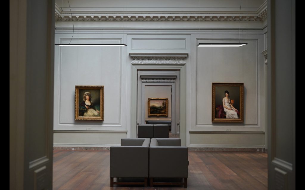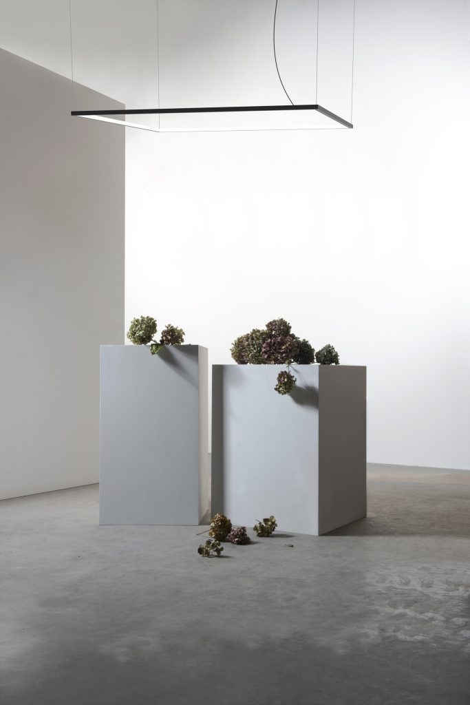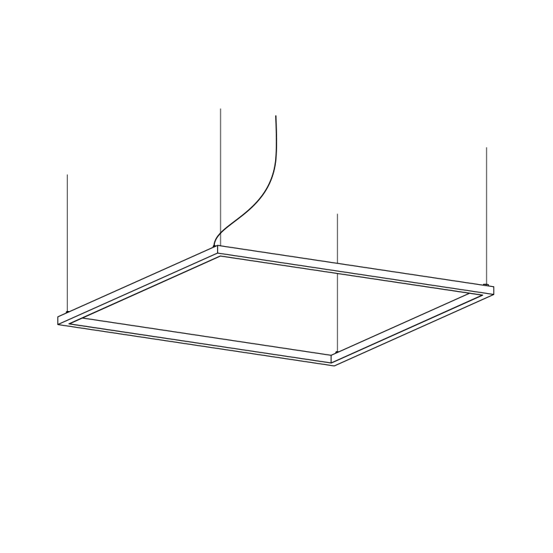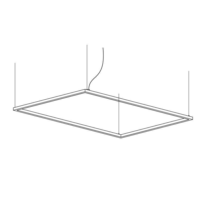 Suspension carrée ou rectangulaire à lumière diffuse. Structure en aluminium laqué blanc, noir ou laiton mat. Diffuseur en polycarbonate opale ou prismatique transparent. Rosace au plafond en métal laqué blanc, noir ou laiton mat. Strip LED.