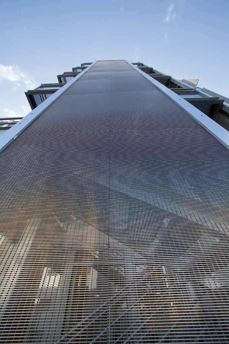 La structure en inox EUROSLOT permet d'habiller les bâtiments d'une double peau qui apparaîtra tantôt transparente, tantôt opaque selon l'intensité lumineuse, l'angle de vue ou la position de l'observateur