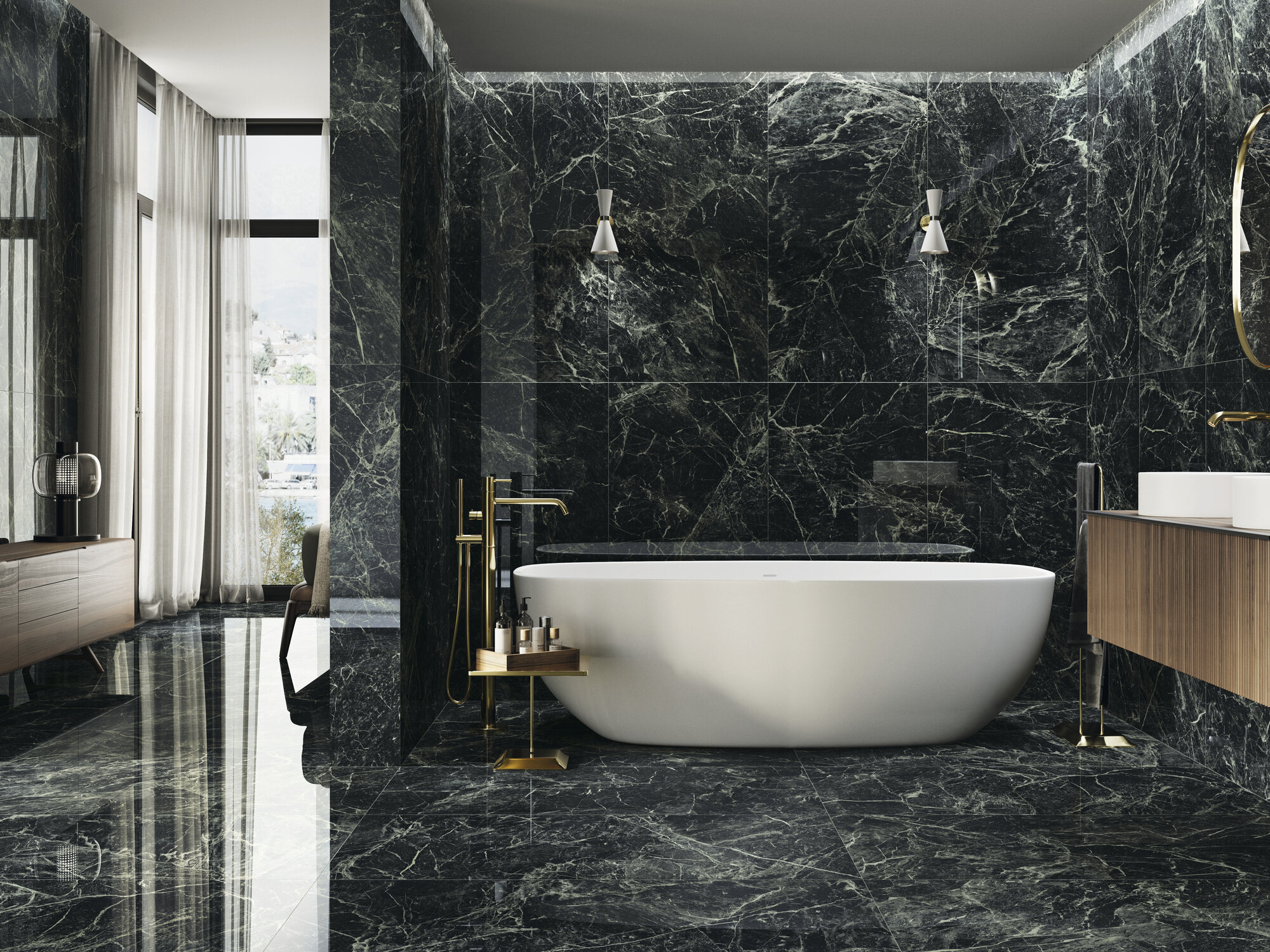 Alpi Green nous transporte dans la majesté des Alpes apuanes, probablement les plus belles montagnes de la Toscane italienne et universellement célèbres pour le précieux marbre extrait de leurs carrières depuis l’Antiquité. Il s’agit d’une pierre sophistiquée et élégante dont les pièces sont capables de montrer une grande variété de tons et de nuances de vert, allant d’un vert intense jusqu’à des veinures avec une touche délicate de vert jade.