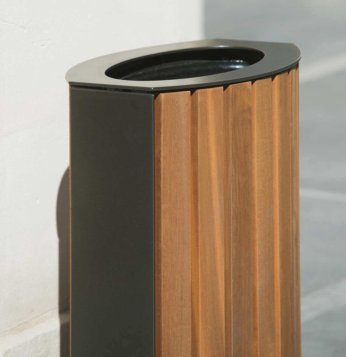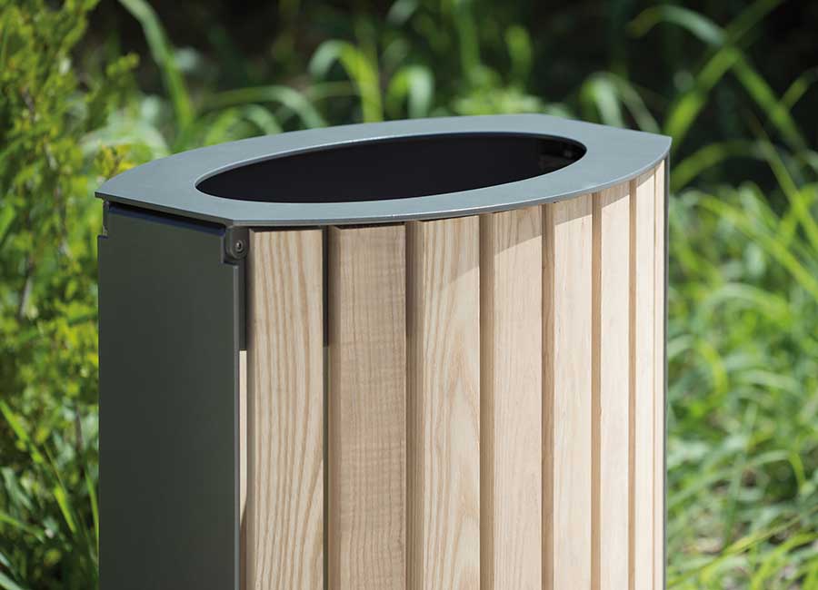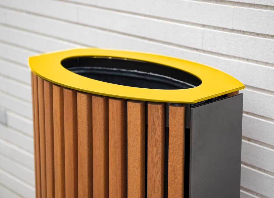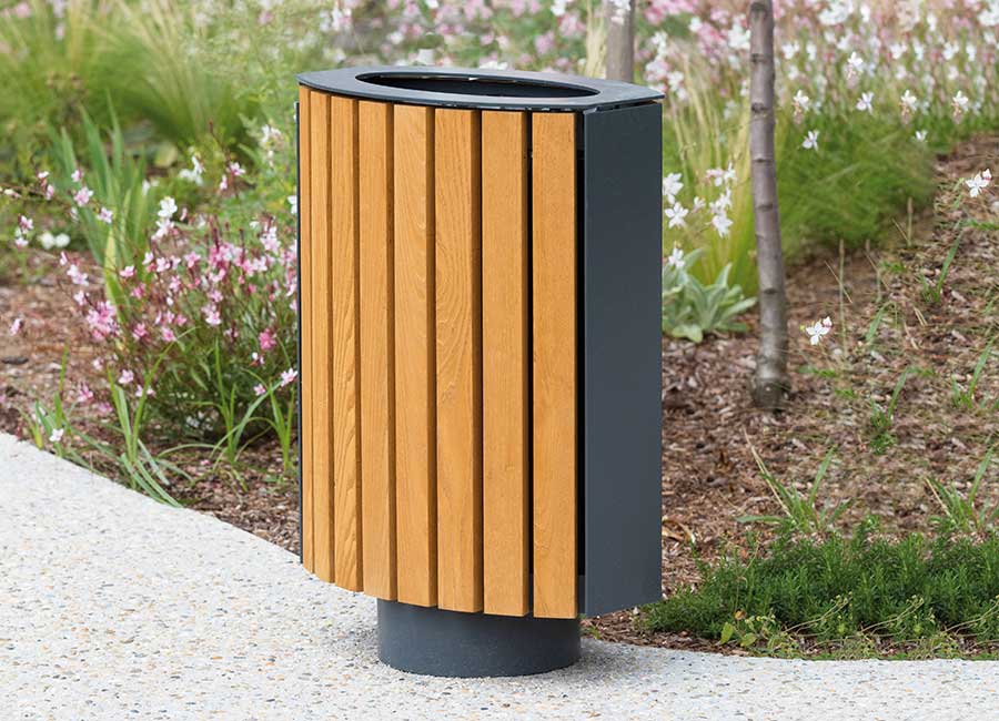 Grâce à sa forme ovale et à son encombrement réduit, la corbeille Bambou 50 L s’intègre facilement dans les environnements contraints, que ce soit en applique ou le long d’un cheminement. L’alliance du bois et de l’acier crée un contraste raffiné, apportant chaleur et élégance à l’espace public. Cette combinaison harmonieuse permet également d’assurer une parfaite coordination esthétique avec les bancs de la marque, en grande ou moyenne section de bois.