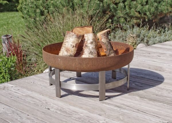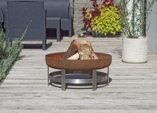 Foyer moderne en acier massif de haute qualité, de haute qualité, fini à la main. Ses caractéristiques compléteront de nombreux décors extérieurs, aussi bien en hiver qu’en été. Ce foyer moderne est disponible en deux tailles différentes pour choisir le moyen et le grand, ce qui le rend adapté à différents environnements paysagers et choix décoratifs. La surface de la cuvette est poncée pour s’assurer que la rouille naturelle se forme au fil du temps. Les pieds sont finis à la main avec de l’acier inoxydable de la plus haute qualité. Ce produit est très durable et durera de longues années. L’acier au carbone utilisé dans la fabrication de ce bol de foyer développera une belle patine avec le temps. Le bol est fabriqué à partir d’acier solide rouillé (au carbone) et il arrive très brillant, presque chromé. Il rouillerait une fois exposé à l’eau. Habituellement, ce processus naturel prend quelques semaines.