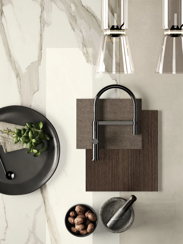 L’élégance naturelle de la dalle en grès effet marbre Calacatta Bernini met en valeur chaque projet où elle est présente.