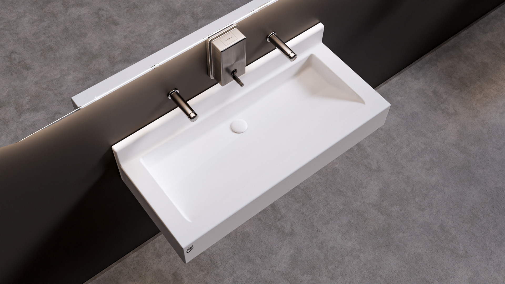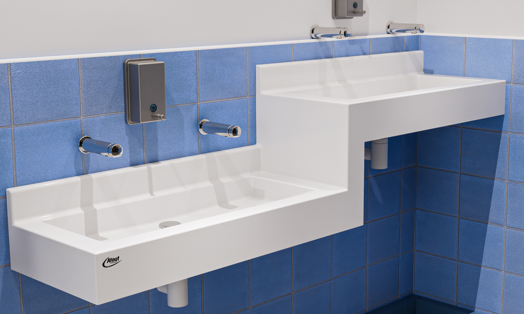 Lavabo collectif - Auge monobloc, PMR de marque Atout Composites, Auge autoportante prête à la pose sur consoles en acier thermolaqué blanc (non visibles), Gel Coat antibactérien, résistant à la rayure, aux produits d'entretien et réparable, Résine avec charge minérale (>50%) armée de fibre de verre, Résistance Feu/Fumée: Gel Coat M2/F1 - Résine M2/F1, Pose à 850mm du sol fini.