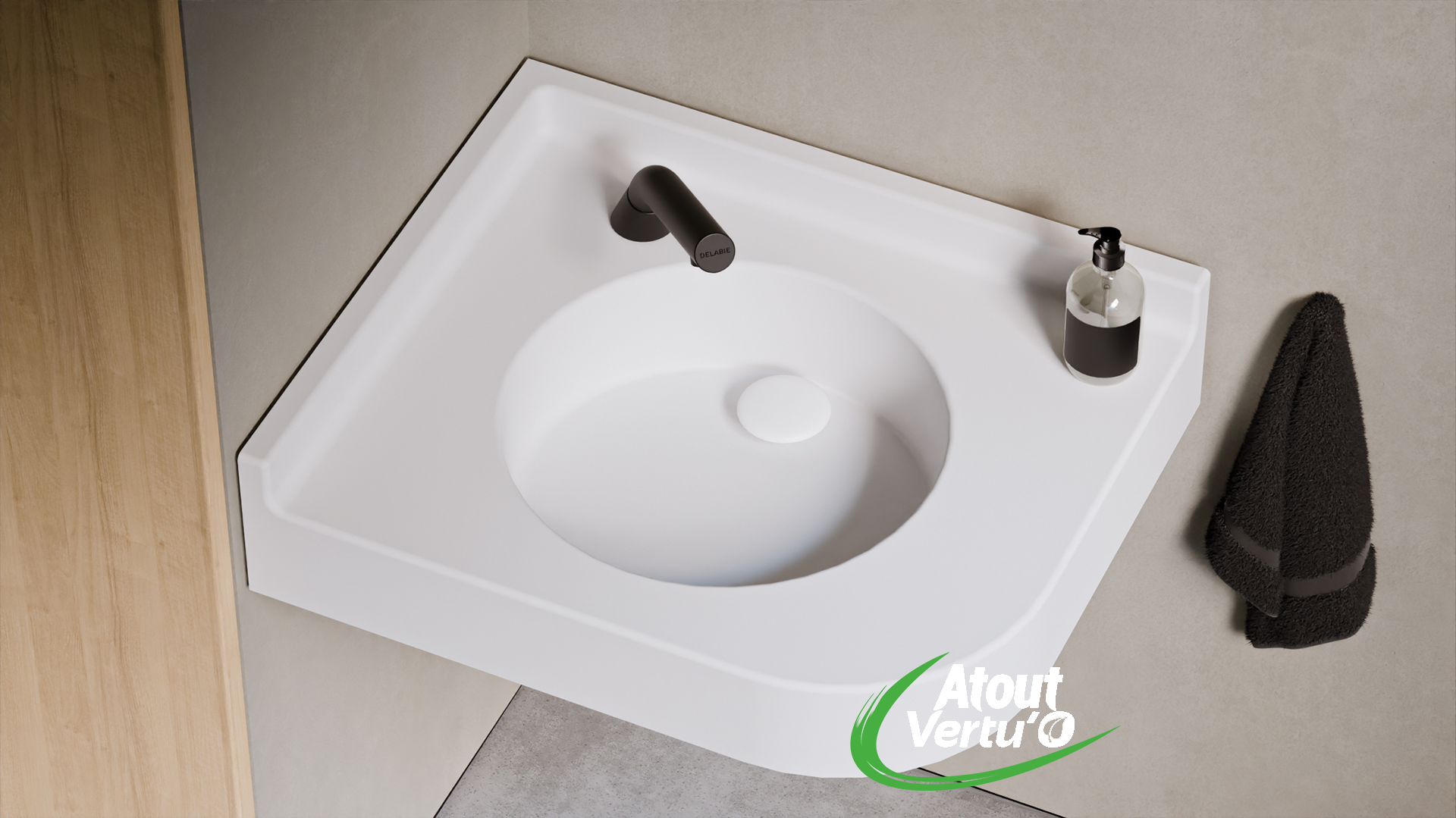 Le produit Plan vasque en angle - LEANSOR - VERTU'O du fabricant ATOUT COMPOSITES classé dans la catégorie Sanitaire - Plomberie - ECS > Appareils sanitaires > Lavabos, vasques est référencé dans la Matériauthèque digitale Materiaux.archi.