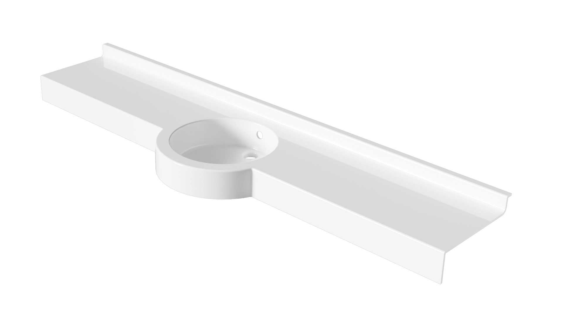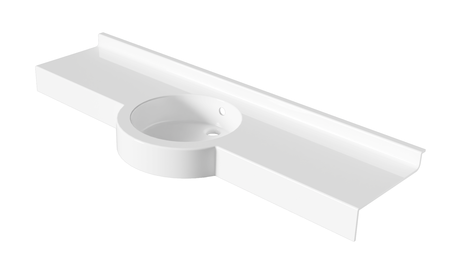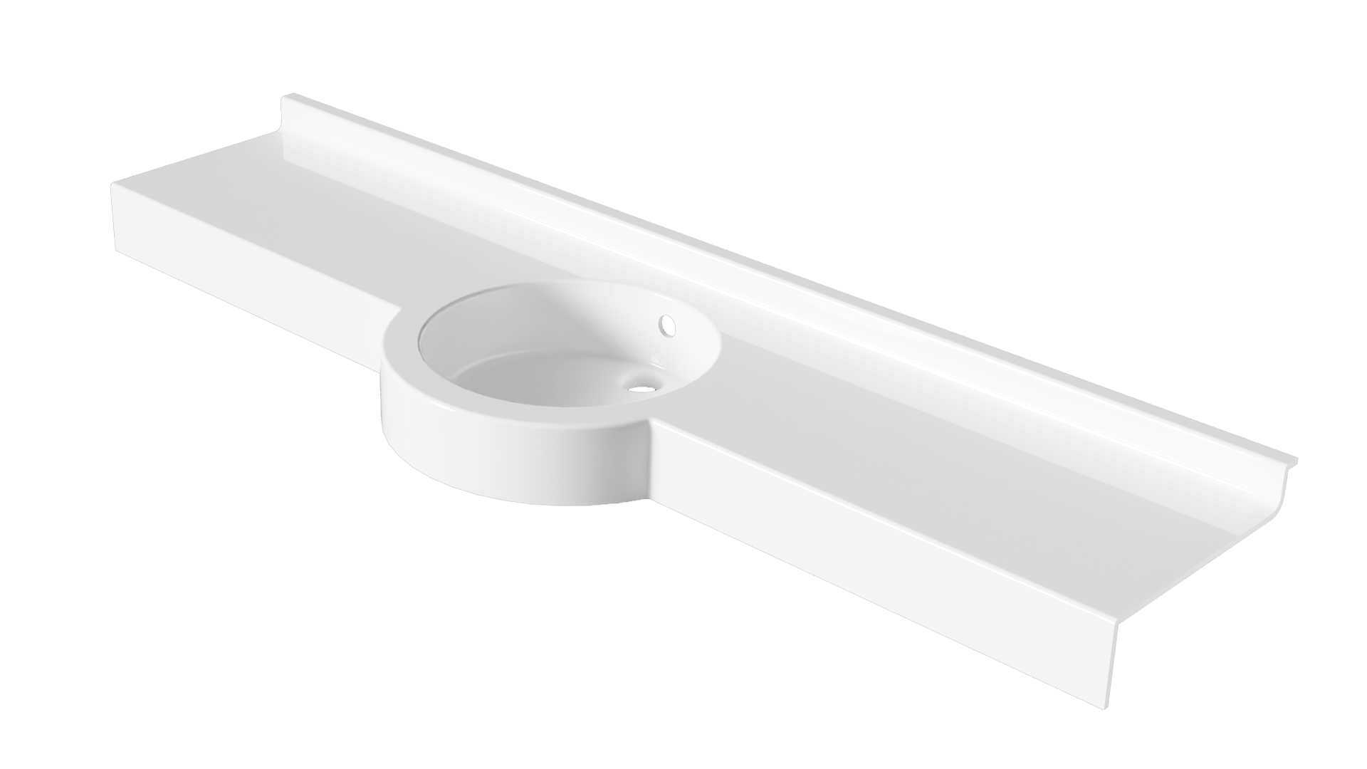 Plan vasque monobloc, autoportant de marque Atout Composites, Gel Coat antibactérien, résistant à la rayure, aux produits d'entretien et réparable, Résine avec charge minérale (>50%) armée de fibre de verre, Résistance Feu/Fumée: Gel Coat M2/F1 - Résine M2/F1, Aucun rayon inférieur à 6mm pour un entretien facilité et une hygiène parfaite.