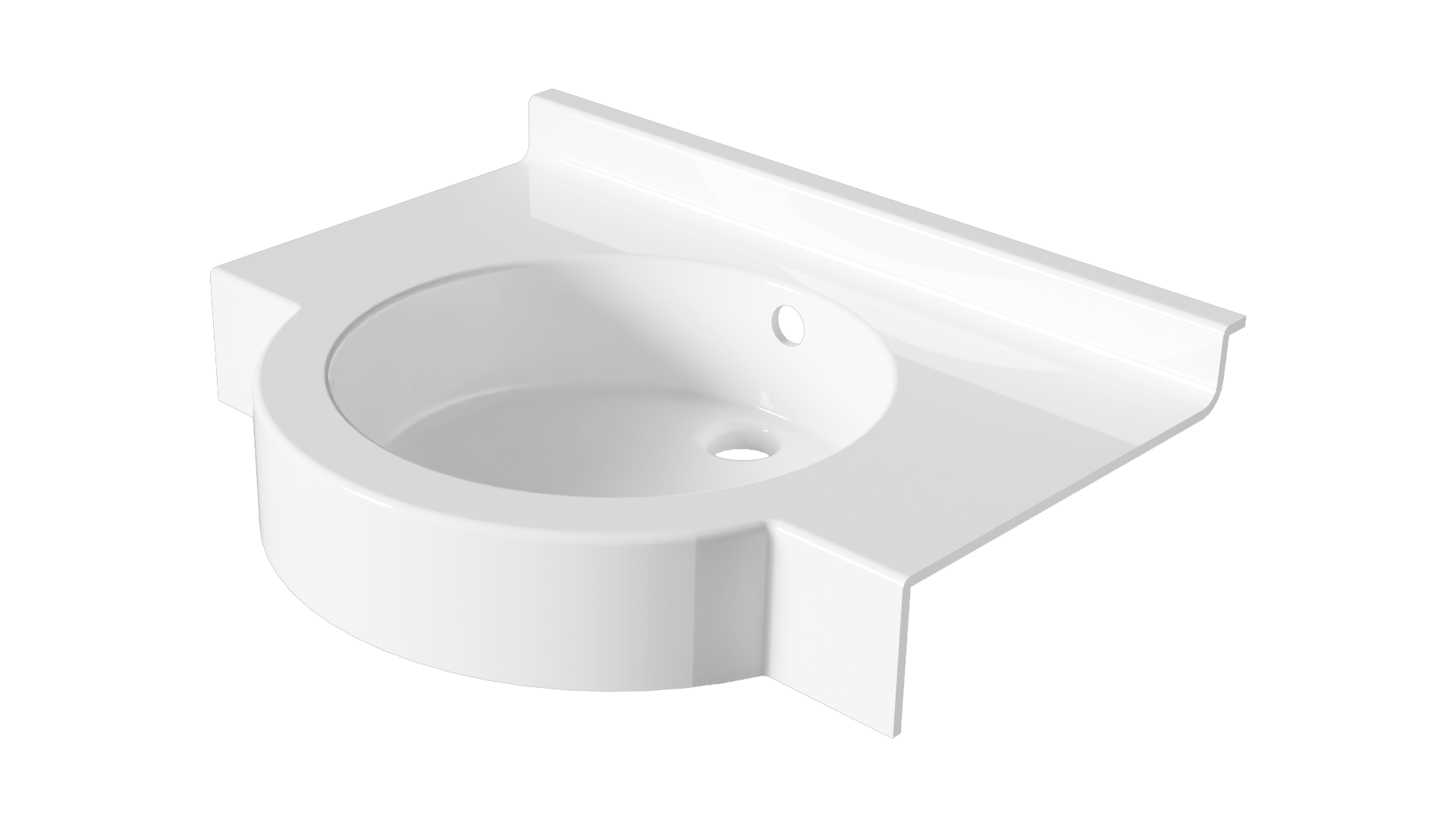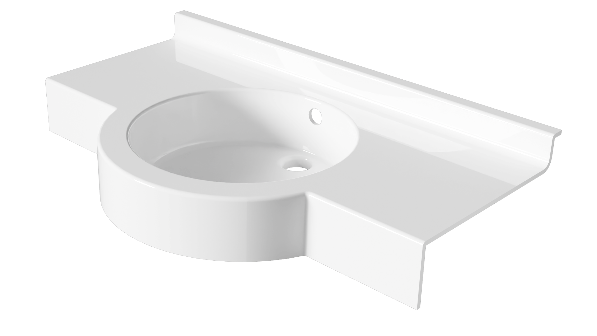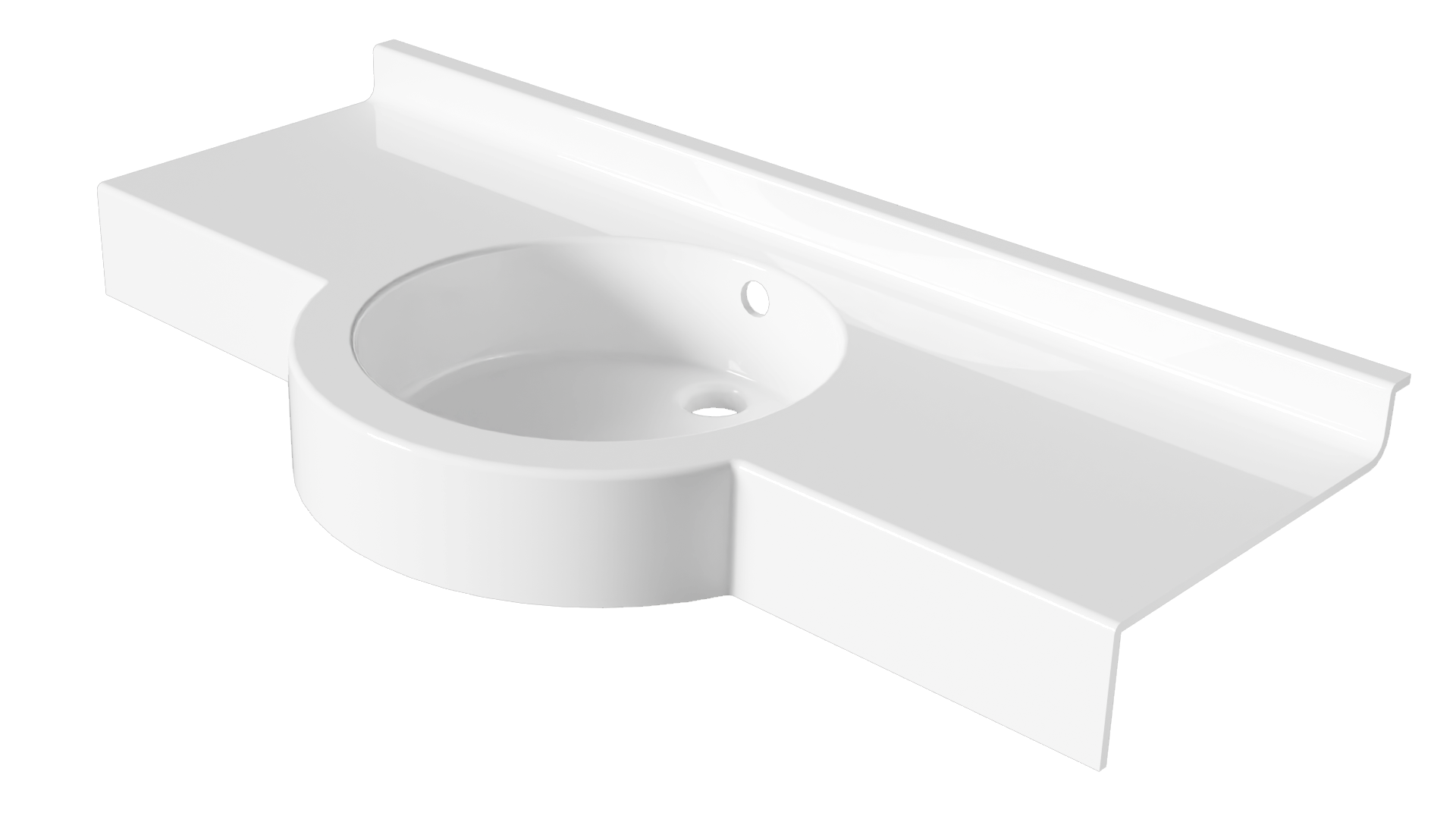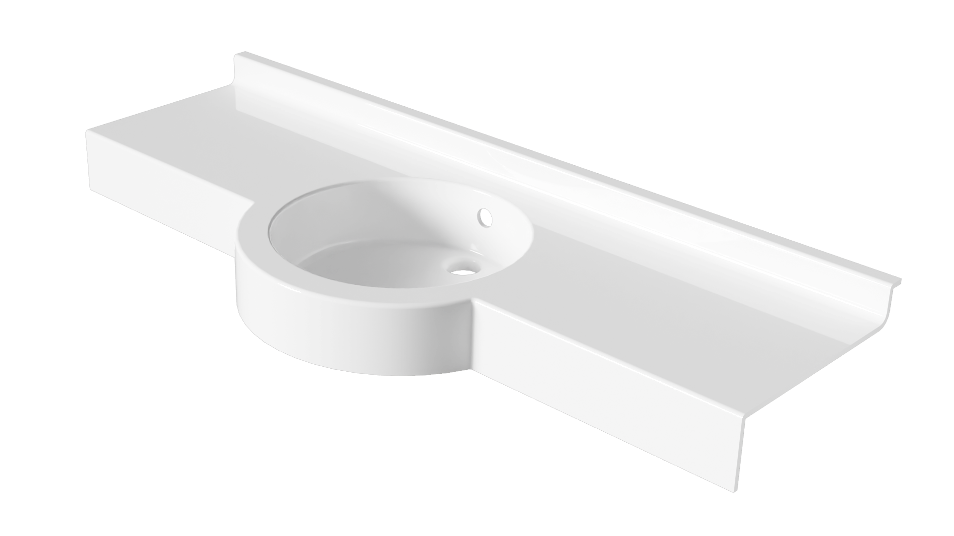 Plan vasque monobloc, autoportant de marque Atout Composites, Gel Coat antibactérien, résistant à la rayure, aux produits d'entretien et réparable, Résine avec charge minérale (>50%) armée de fibre de verre, Résistance Feu/Fumée: Gel Coat M2/F1 - Résine M2/F1, Aucun rayon inférieur à 6mm pour un entretien facilité et une hygiène parfaite.