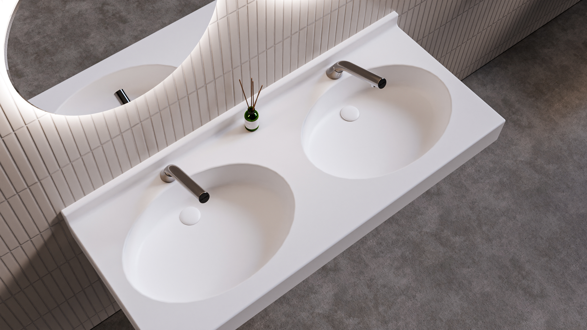 Plan vasque monobloc, autoportant de marque Atout Composites, Gel Coat antibactérien, résistant à la rayure, aux produits d'entretien et réparable, Résine avec charge minérale (>50%) armée de fibre de verre, Résistance Feu/Fumée: Gel Coat M2/F1 - Résine M2/F1, Aucun rayon inférieur à 6mm pour un entretien facilité et une hygiène parfaite.
