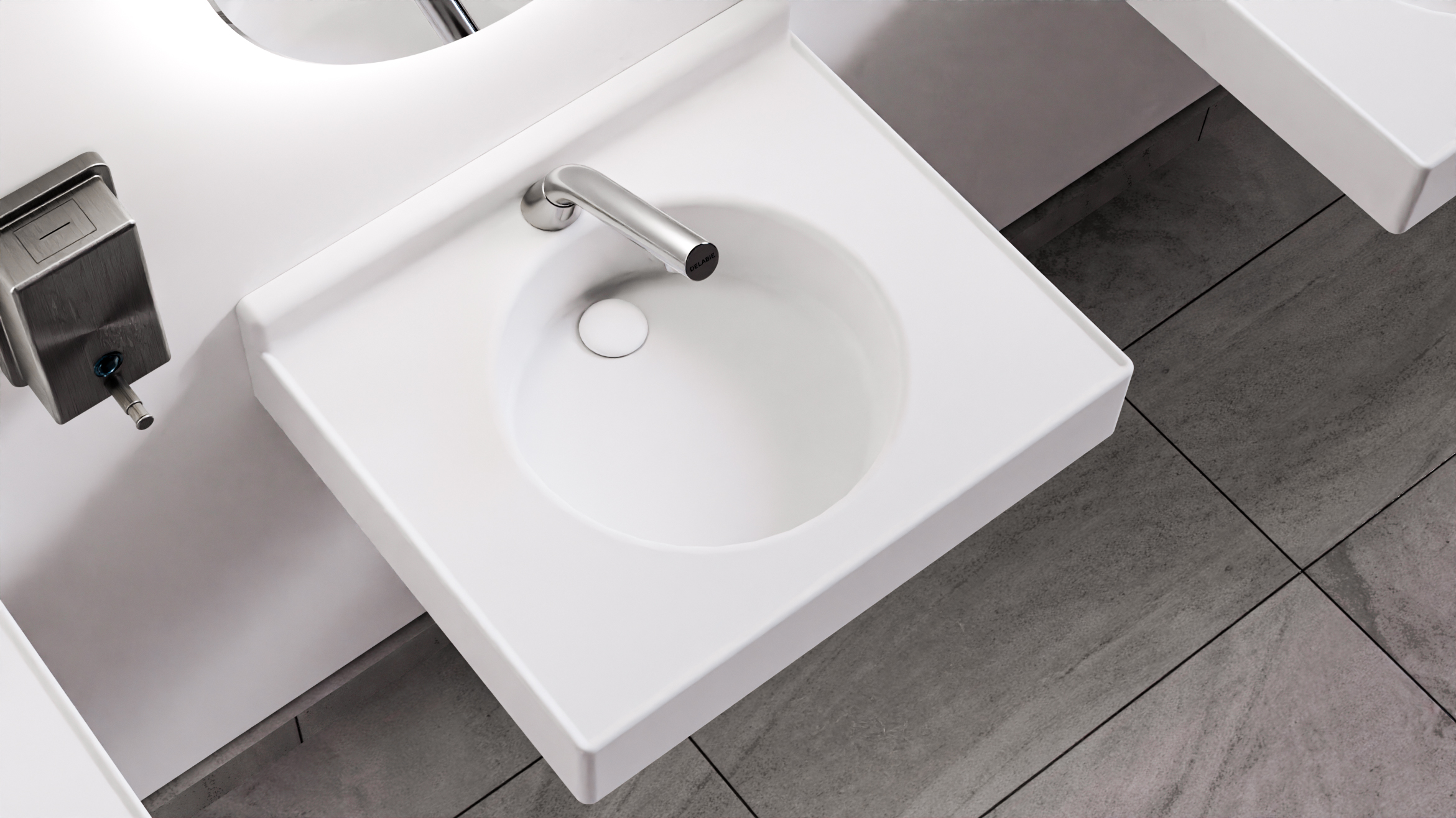 Plan vasque PMR de face gamme Édition, à cotes fixes. L'ajustement des cotes est réalisé à l'installation.
