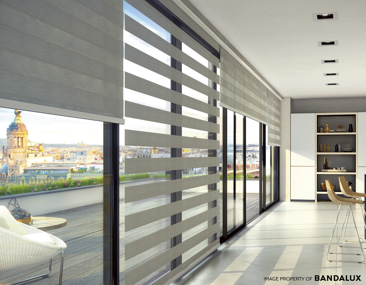 Les stores enrouleurs jour et nuit sont composés de bandes horizontales intercalant un tissu transparent et un tissu semi-opaque qui se superposent lorsqu'ils sont actionnés. Ils garantissent ainsi une gestion optimale de la lumière.