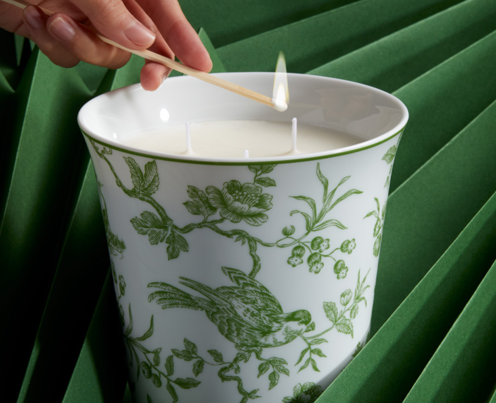 Pot à bougie décoré au motif Albertine, accompagné d’une bougie parfumée avec l’une des 6 fragrances imaginées par Olivia Giacobetti spécialement pour Bernardaud.