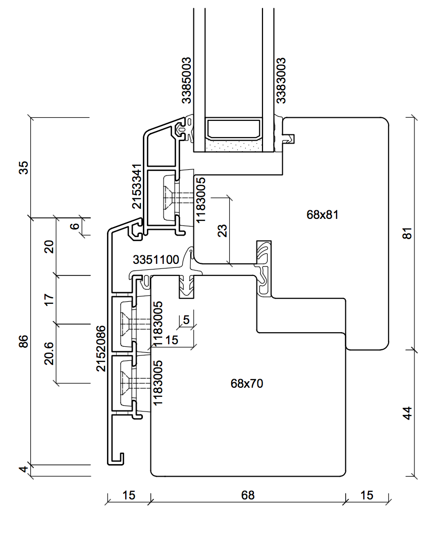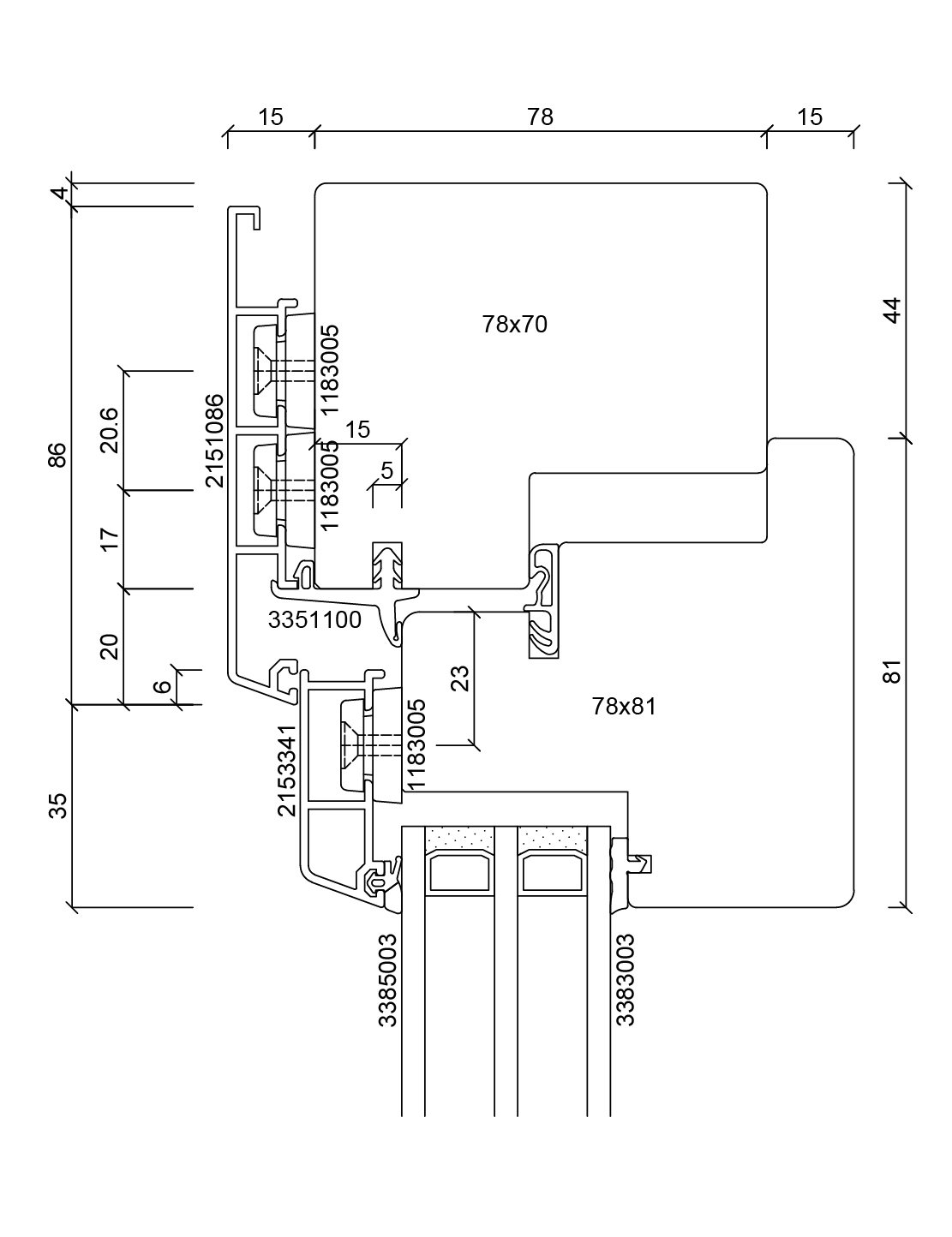 Le dormant et l’ouvrant forment deux niveaux différents. Entre le vitrage et l’ouvrant se trouve une distance de 18 mm. La section apparente de l’ouvrant est de 35 mm et est biaisée. Pour des exigences statiques spécifiques, le profilé de l’ouvrant peut être élargi. L’évacuation de la feuillure est faite par des poinçonnements cachés sous la traverse basse du dormant. En option peut être ajoutée une évacuation visible avec un capuchon de protection.