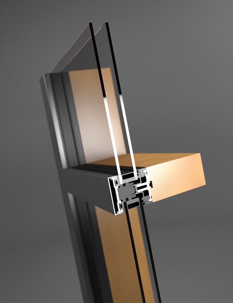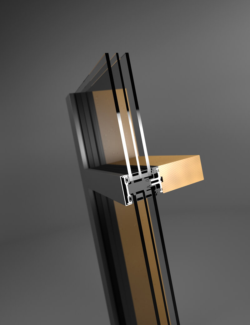 Façade isolante correspondant aux standards de la maison passive construite en mur-rideau avec des planches en bois lamellé ou avec des matériaux en bois d’une largeur de 50 mm. L’épaisseur du profilé correspond aux exigences de construction et statiques. Les dimensions du profilé doivent correspondre aux besoins statiques, et avoir une flexibilité maximale pour répondre aux objectifs des normes pour façade mur-rideau DIN EN 123830. Les exigences spécifiques en termes d’isolation et d’étanchéité de la construction de la façade représentent des normes impératives.