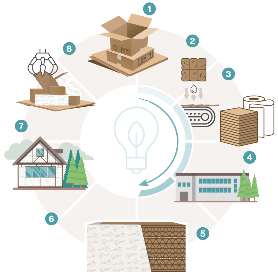 Fin de vie du bâtimentLes murs en carton sont récupérés et renvoyés vers le tri + recyclage.