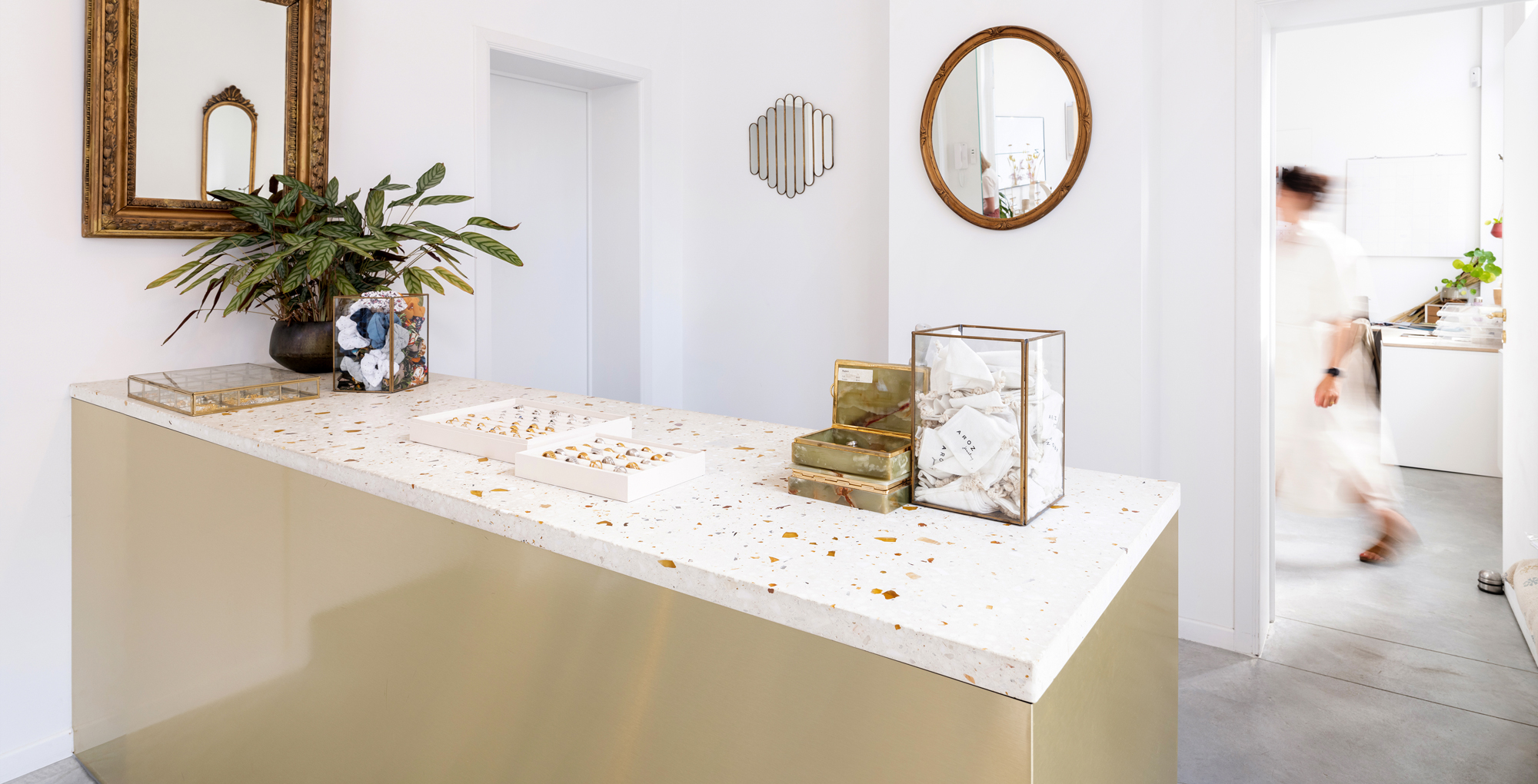 Le revêtement pour sols, murs et meubles BEALSTONE® est idéal pour créer des espaces modernes, continus et sans démarcation, au style Terrazzo affirmé.