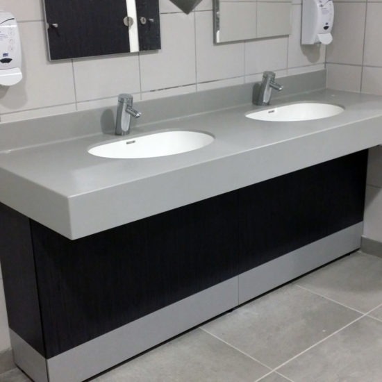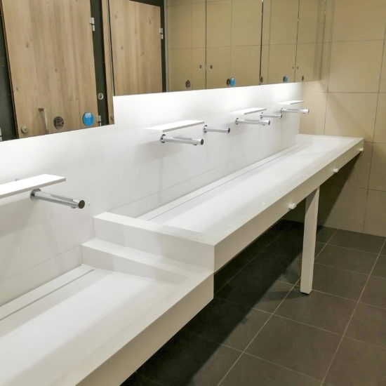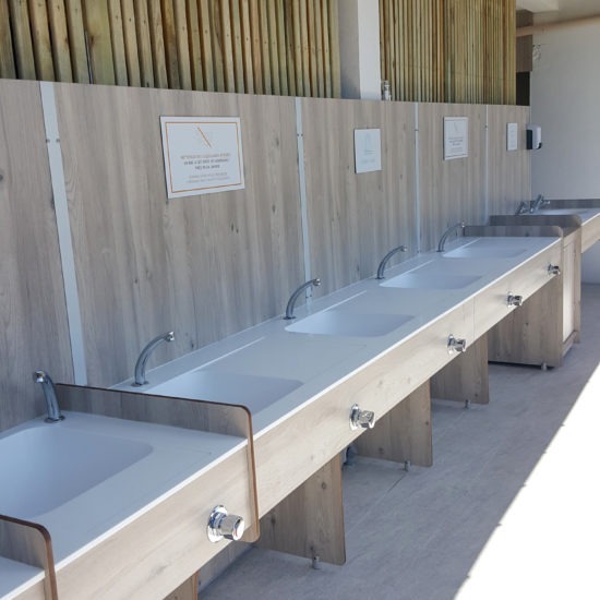 Les espaces sanitaires ne sont pas oubliés puisque nous avons créé une gamme de lavabos collectifs qui permettent de faire ressortir l’image de l’entreprise dans chaque espace.