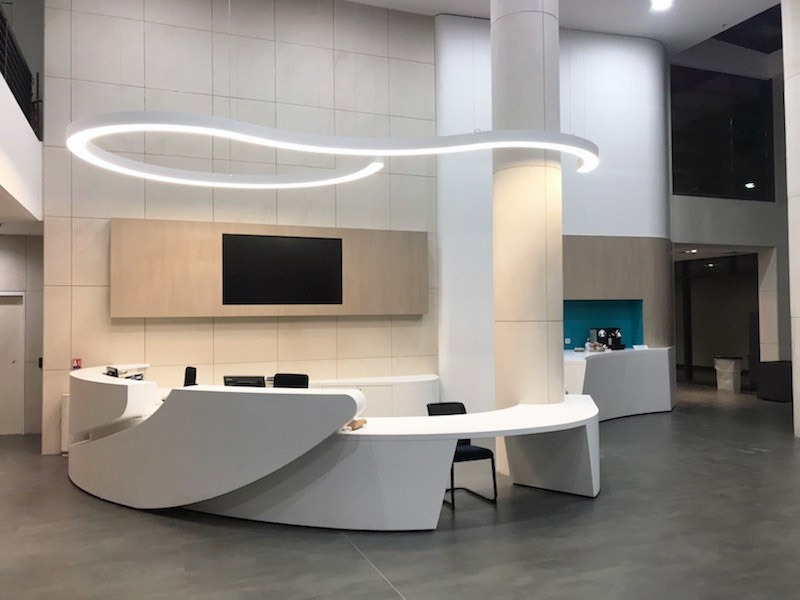 Les espaces se doivent aussi être agréables. La Solid Surface est adaptée à une multitude d’application, notamment dans les halls des bâtiments professionnels (banque d’accueil, guichet, comptoir, banc, mobilier, présentoir…). Sa douceur permet de rendre les lieux plus chaleureux.