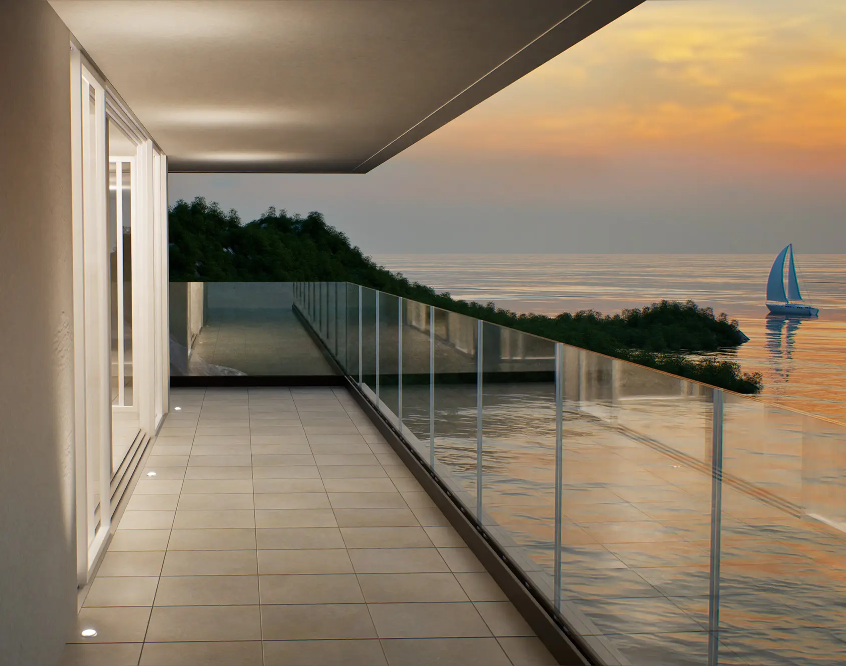 Garde corps entièrement vitré, posé en nez de dalle avec un capot de finition pour masquer la dalle. Idéal pour les architectures modernes ou en rénovation.