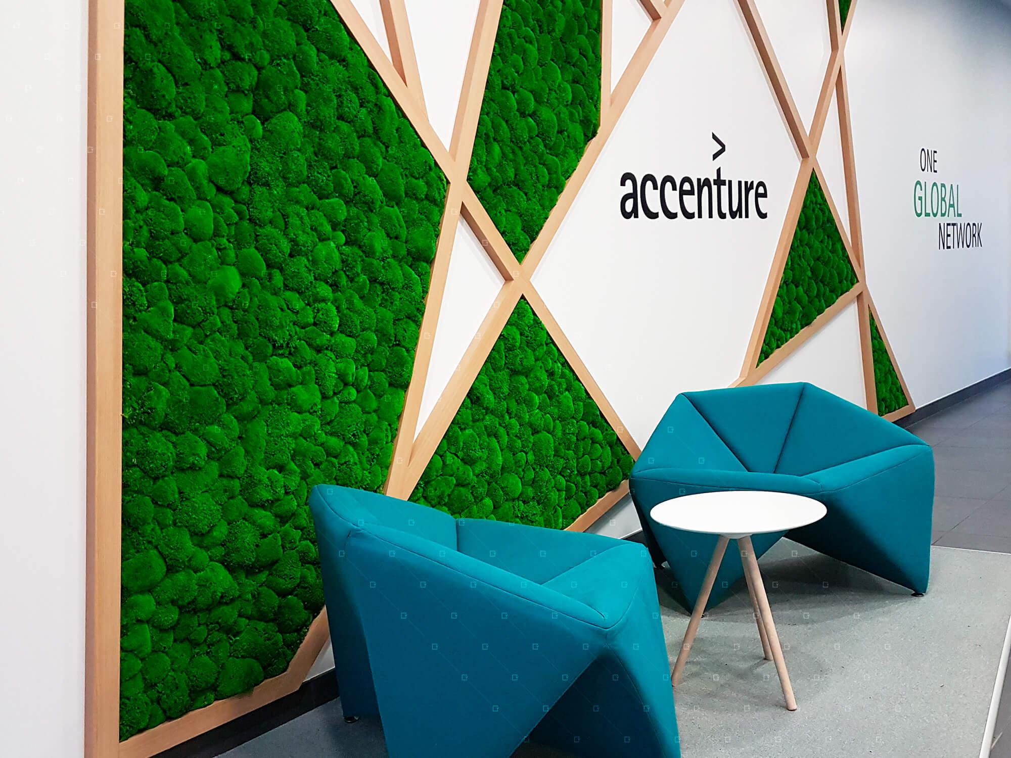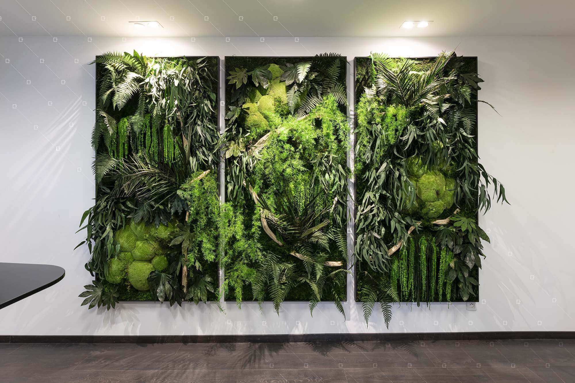 Mur végétal intérieur – Mur végétal stabilisé – Mur végétal intérieur Collection Signature – L’équipe a fait le choix d’utiliser une mousse des bois pour le fond du mur végétal intérieur, une couleur vive mais une matière relativement plane permettant de faire valoir les autres éléments de