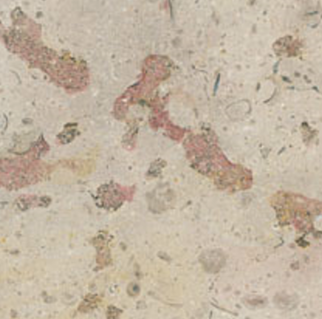 Aspect : Fond beige rosé, nombreuses coquilles, fossiles, grain très fin