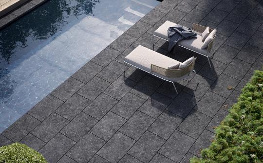 La finition 'EnoLuce’ d’une couleur gris anthracite profond et d’aspect mat présente un état de surface légèrement rugueux parsemé d’éclats. Ce traitement de surface fait ressortir toute la nature minérale et les particularités d’aspect de la pierre bleue.