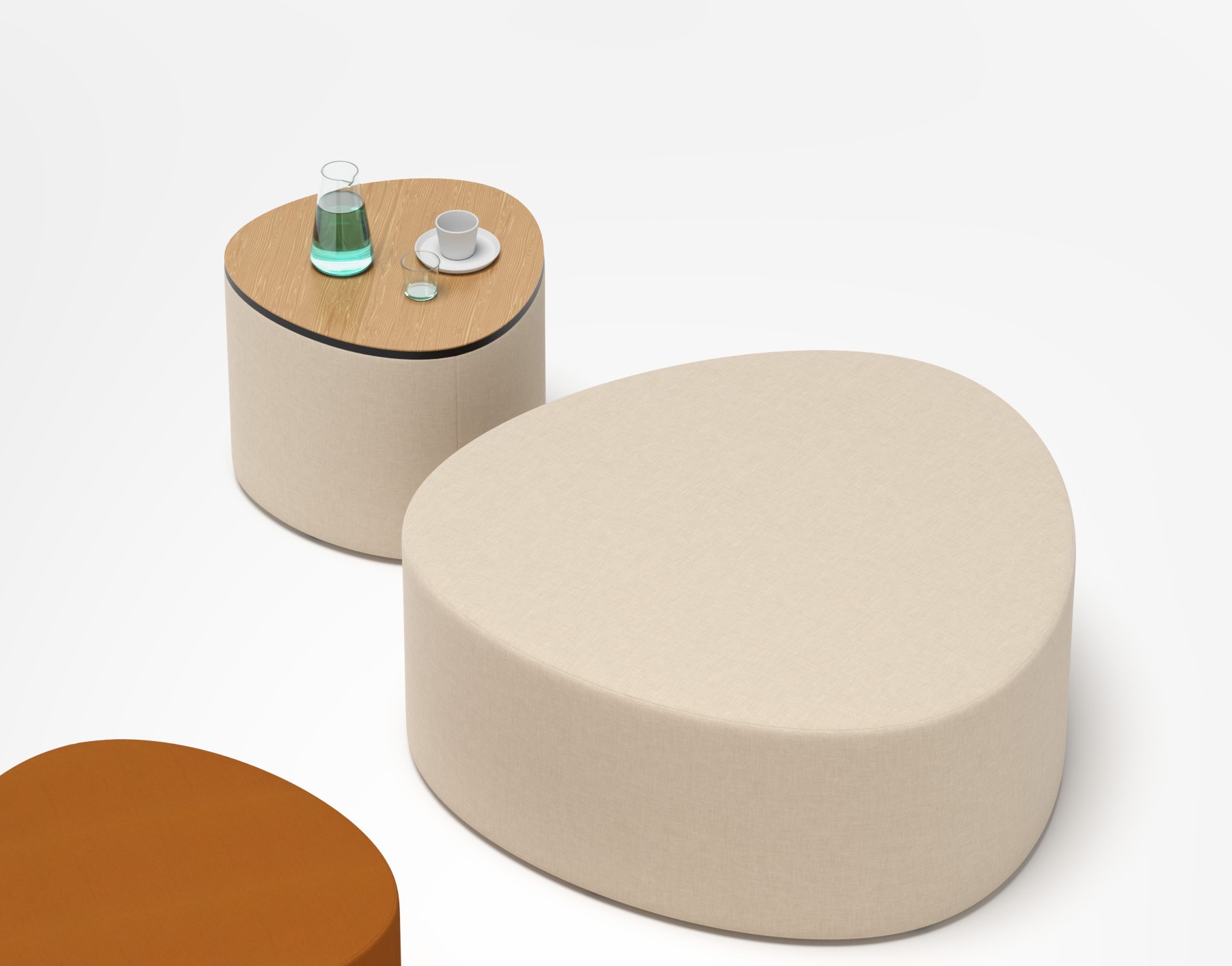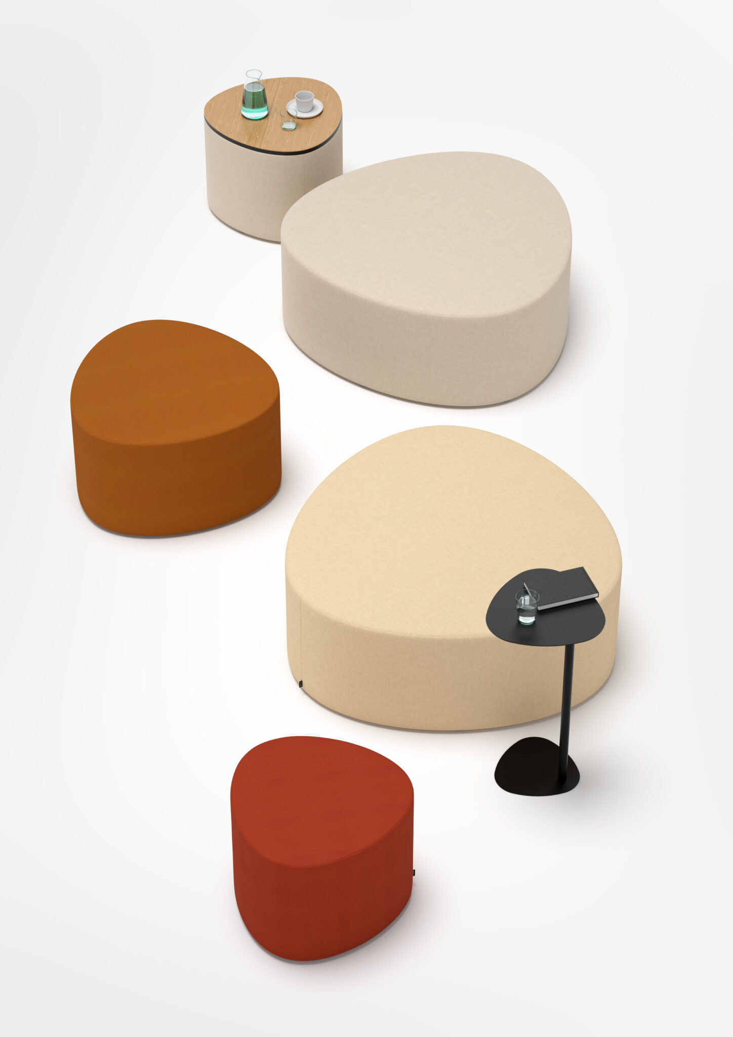 Les tables Pully Island se combinent parfaitement avec les éléments d'assise Pully Island de Pully Poufs. Le piètement rembourré est insonorisant. Les tables sont disponibles en forme triangulaire ou carrée avec des coins arrondis et sont livrées avec des plateaux de table dans différentes finitions.