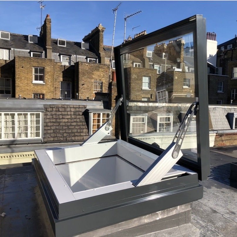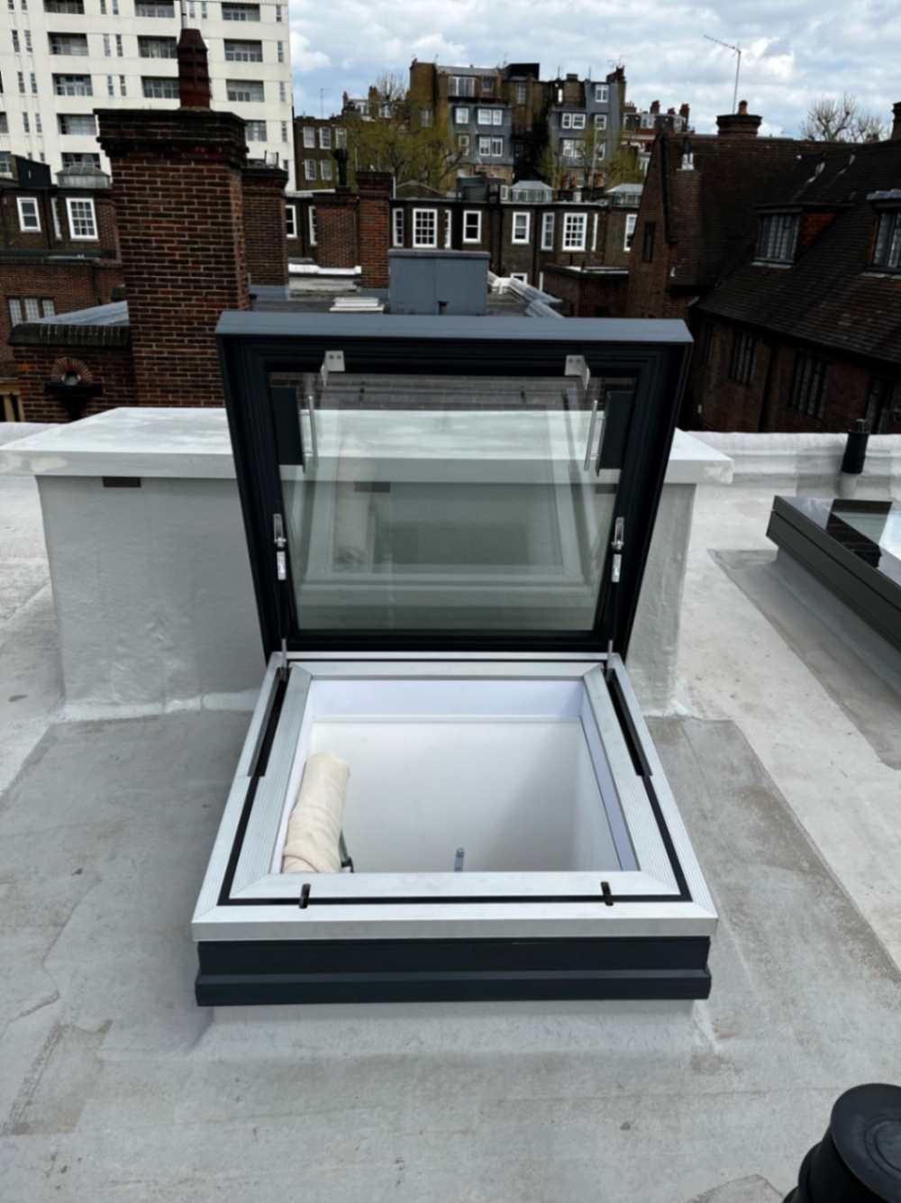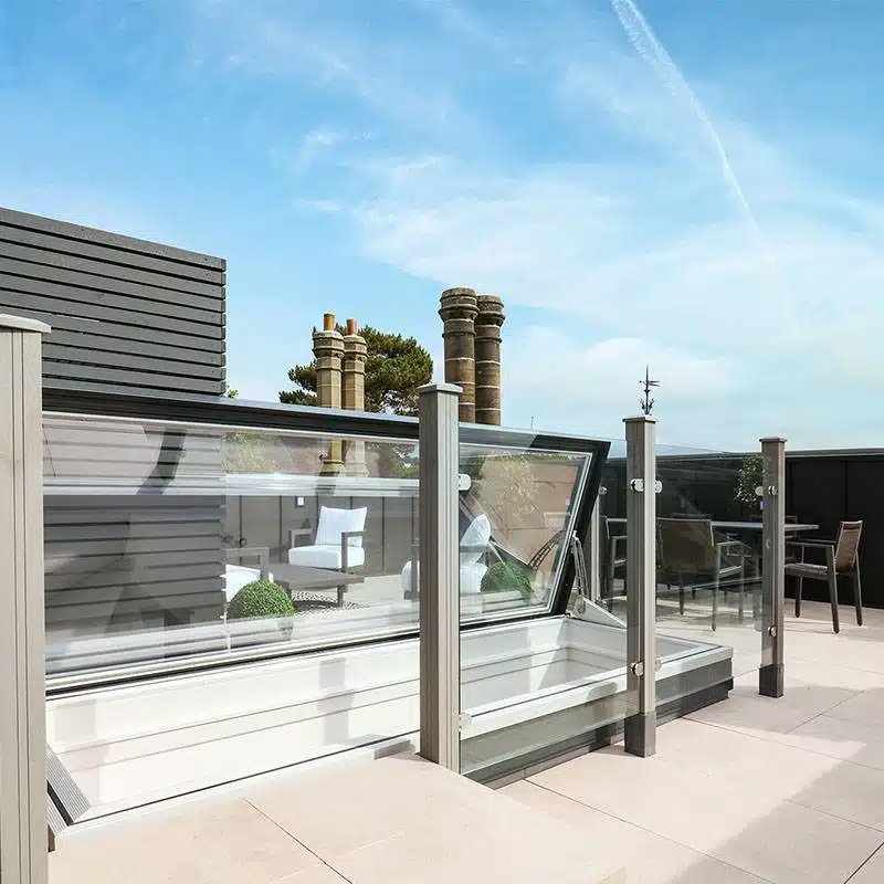 Cet accès toiture motorisé sur mesure s’ouvre à 85° pour vous laisser confortablement accéder à votre terrasse.