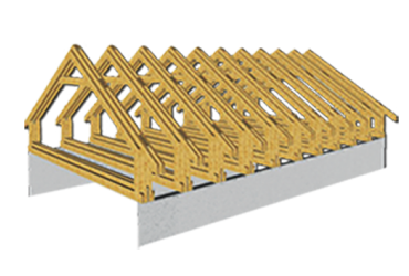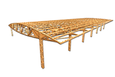 4- Les fermes Ariane® : fermes en treillis assemblées dans les noeuds sur des inserts en contreplaqué bouleau et des connecteurs de type vis ou clou. Ces fermes peuvent être à facettes, asymétriques, monopentes ou bipentes et principalement réalisées sur poteaux bois encastrés en tête formant des portiques de deux articulations (éventuellement trois).