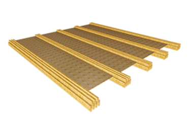 1- La dalle O'portune® : fabriquée à partir de l'assemblage de planches décalées sur la hauteur, connectées avec des vis pour des portées libres jusqu'à 12-13 mètres et des charges usuelles de 250 à 500 kg/m².