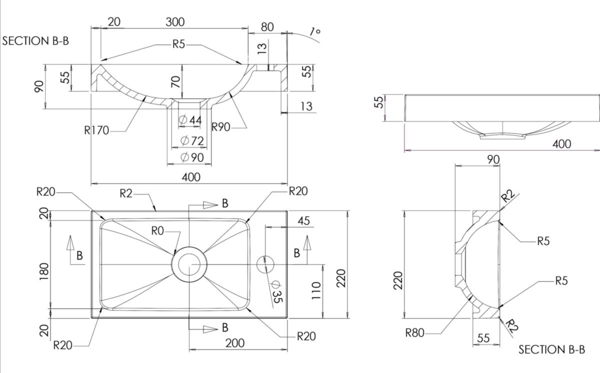 Lave-mains en marbre de synthèse et revêtu de Gelcoat.