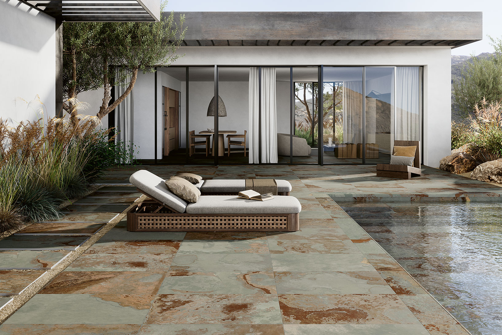 Ses graphismes marqués et irréguliers réinterprètent sur des carreaux effet pierre une ardoise riche en matière. Avec ses contrastes chromatiques qui varient du blanc au jaune, du rouge au marron et du gris au vert en passant par la rouille, Bali renferme toutes les couleurs les plus intenses de la Terre. Bali est idéale pour une pose dans des piscines et des extérieurs et est disponible, pour ces destinations d’emploi spécifiques, avec une surface antidérapante, en plus de la version habituelle pour intérieurs. L’effet de brillance cristalline est exceptionnel, notamment lorsque celle-ci est utilisée pour le fond des piscines : de profonds reflets turquoise, verts et bleus dégradés évoquent les atmosphères élégantes et exotiques des plus belles îles du monde.