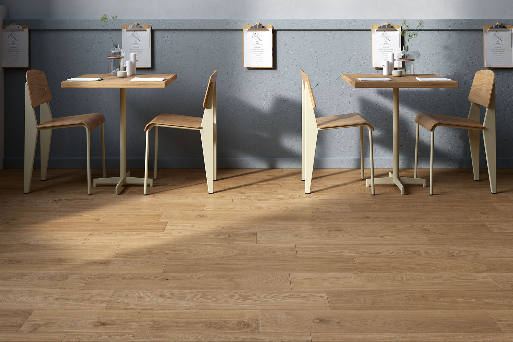 La caractéristique de la collection est de recueillir 3 essences différentes en bois, en se proposant donc comme un ensemble de surfaces effet bois très fidèles aux matières d’origine : les veinures douces du Rovere (chêne rouvre), les colorations intenses du Noce Americano (noyer d’Amérique) ainsi que la variabilité des essences de Larice (Mélèze) reproposé avec le même graphisme dans la tonalité la plus chaude Castagno (Châtaignier). La variabilité de tons et de textures sophistiquées est le résultat d’une technologie à l’avant-garde qui offre ce qu’il y a de plus recherché et exclusif dans le grès cérame effet bois. Parfaitement associable aux autres collections Coem, grâce aux chromatismes calibrés qui se marient bien avec les surfaces effet pierre et ciment, il peut délimiter des zones fonctionnelles dans le salon et dans la cuisine ou être interprété pour des applications inédites, comme revêtement mural aussi.