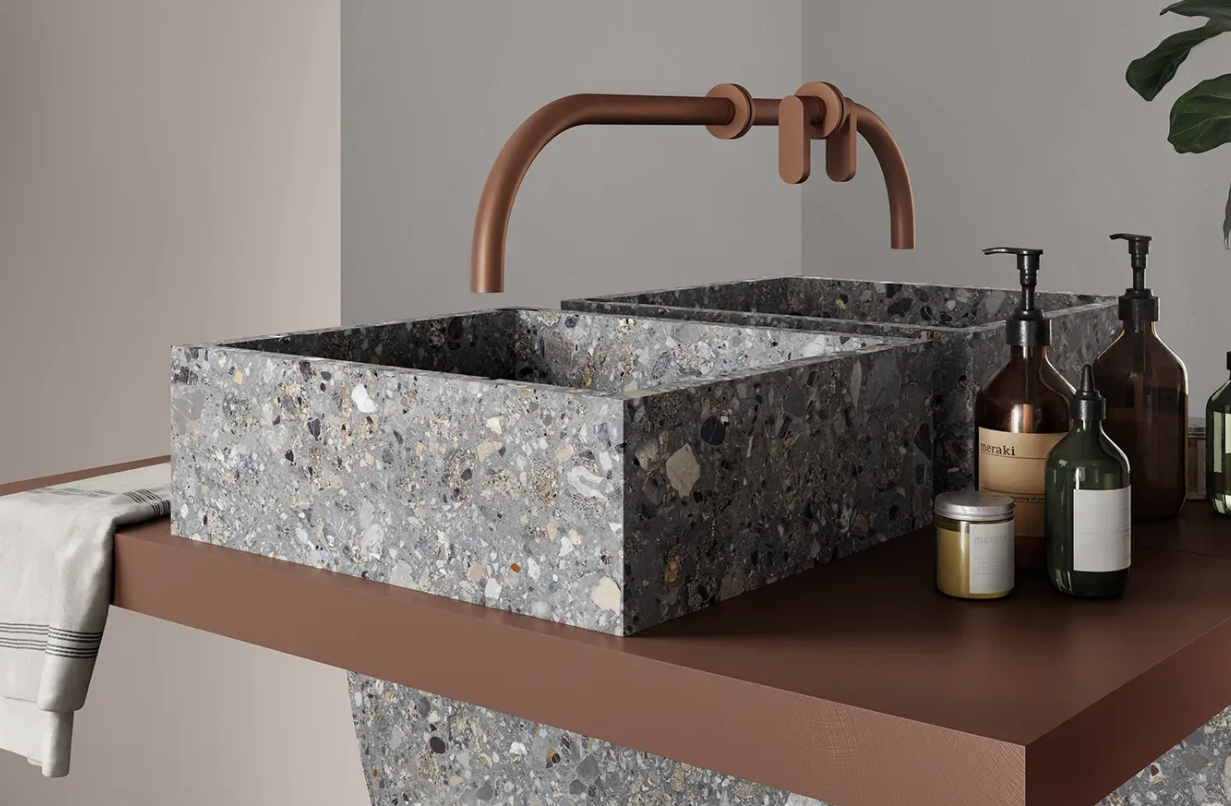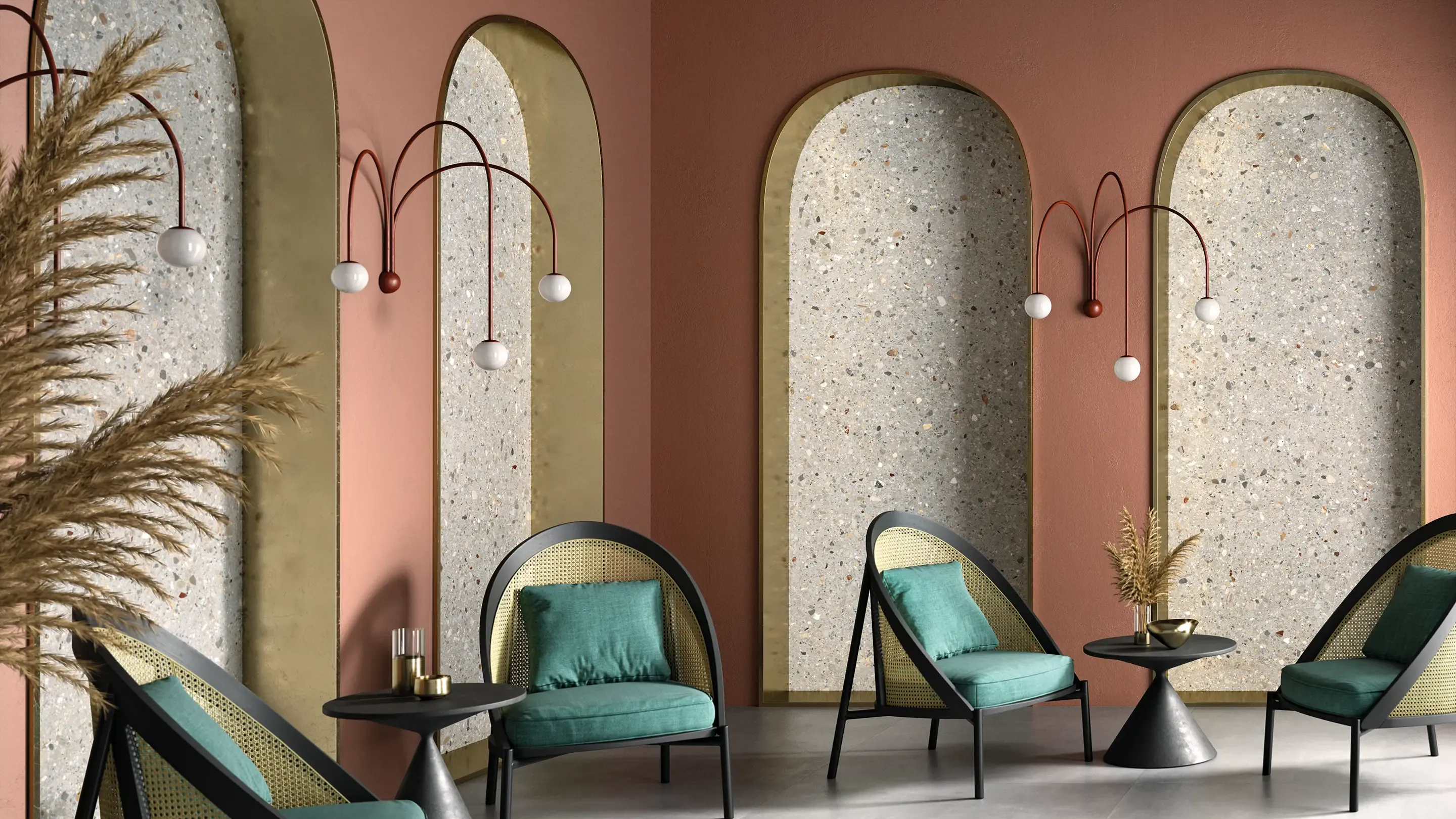 Dolmix étonne par sa rigueur graphique et son goût décoratif. Le mélange de couleurs de galets aux multiples facettes maintient l'attrait du matériau source : façonné par le temps sur les pentes des montagnes italiennes, il exprime une force esthétique inhabituelle dans la conception des pièces et des espaces de la ville.