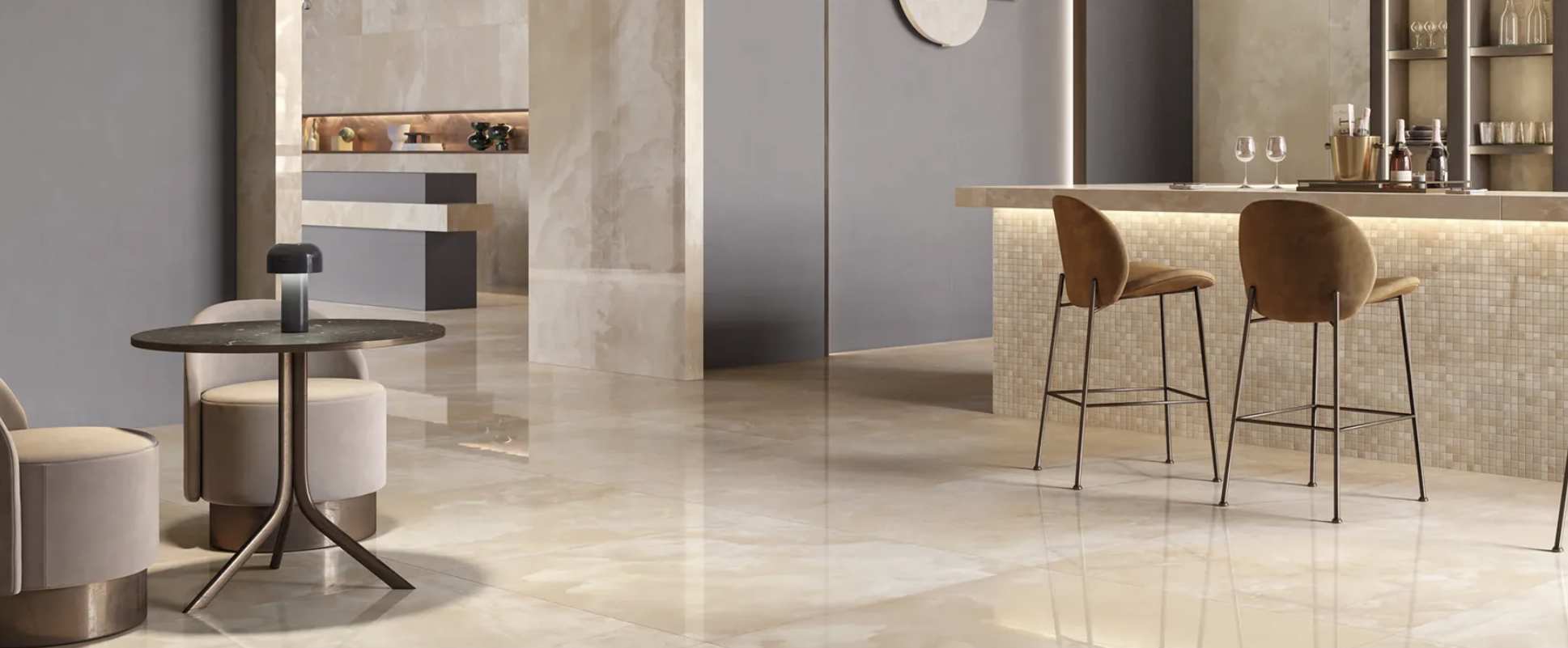 Cette ligne de surfaces dans grès cérame effet Onyx il s'intègre dans la large gamme de billes rodées Keope.