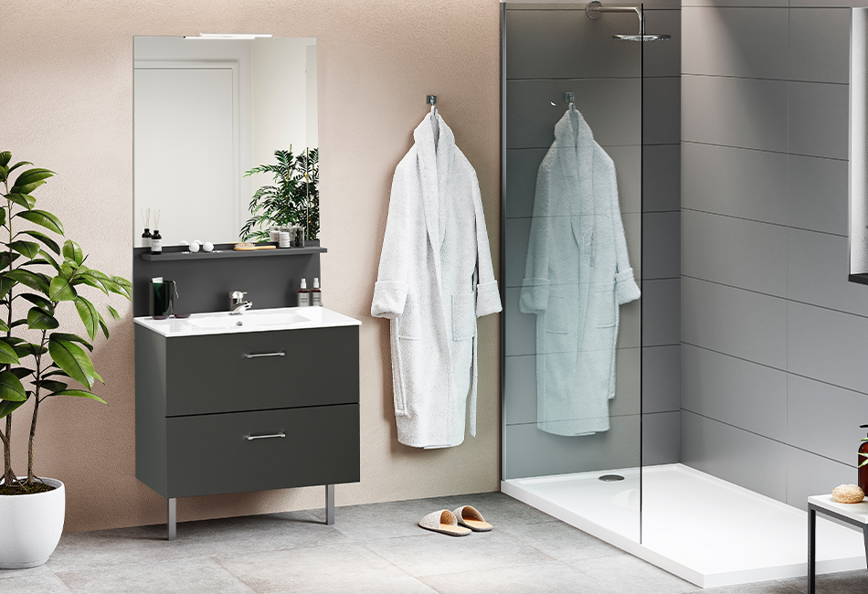 L’ensemble Bora tiroirs comprend un plan vasque céramique fin au design contemporain, un meuble 2 tiroirs coulisses métal sur pieds, avec miroir et applique horizontale en partie haute. Un choix de 6 décors de façades donne la possibilité de personnaliser le rendu final du meuble pour l’acquéreur