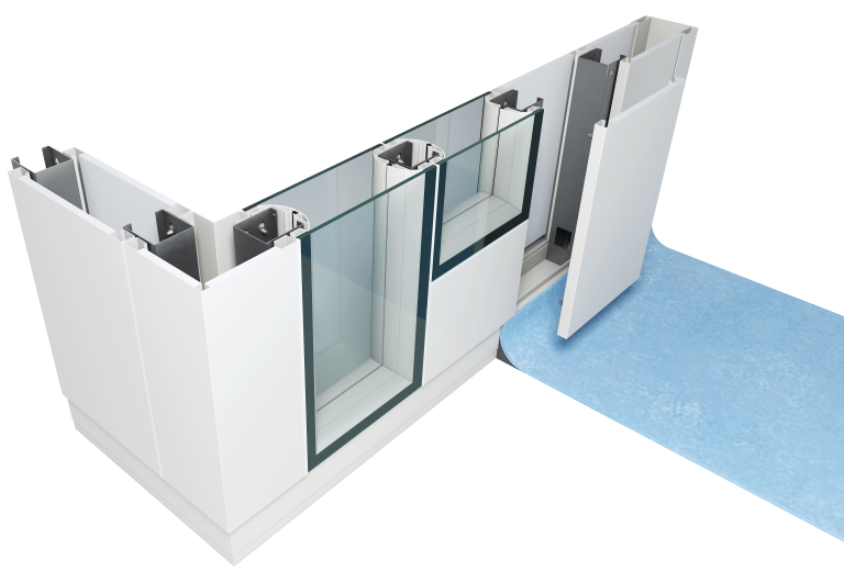La cloison bi-bloc est constituée de deux parements modulaires, interchangeables et démontables individuellement. Ceux-ci sont fixés sur des poteaux verticaux. La surface est parfaitement lisse, facilement nettoyable et adaptée aux exigences des salles propres. Ce principe permet la maintenance d’une salle sans déqualifier la salle propre adjacente.