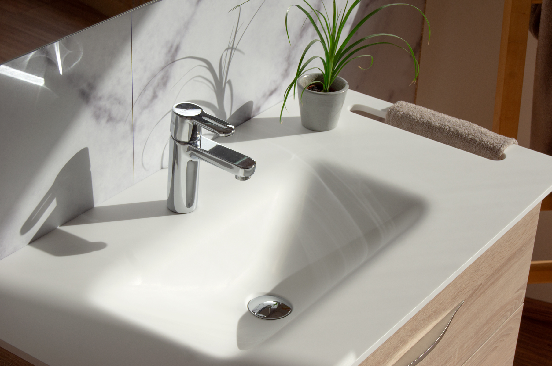 Plan de toilette avec vasque rectangulaire thermoformée dont les angles sont très adoucis, grâce à la technique du thermoformage. Très facile d’entretien, fabriquée en KRION, matière non poreuse, hygiénique, inerte aux bactéries, durable et réparable. Il existe 3 modèles de vasques, dont certaines aux normes PMR