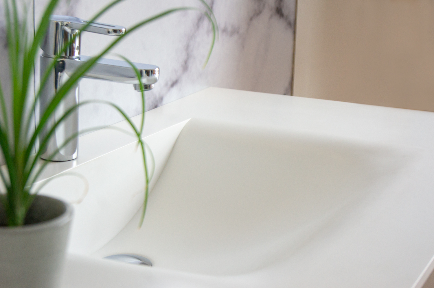 Plan de toilette intégrant une vasque de forme rectangulaire avec des angles très adoucis à l’avantet sur les côtés. La face arrière est assemblée à angle droit et lui donne du caractère.