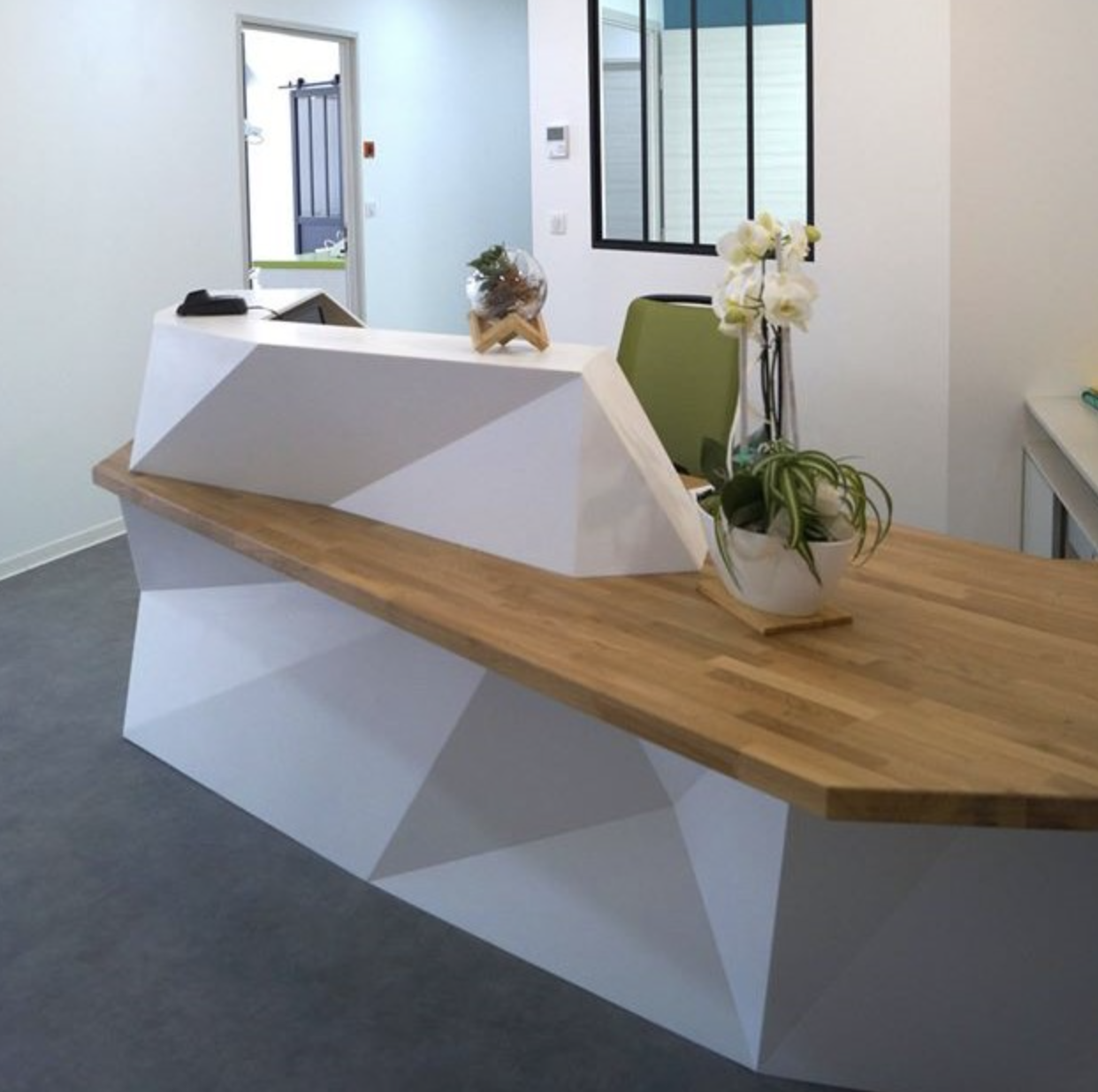 La solid surface offre des caractéristiques très vastes en therme de créativité et ceci lui confère un caractère propre. Elle s’adapte parfaitement aux espaces de services accueillant du public. En effet, que les lignes dessinées par l’architecte soient rectilignes et épurées, ou facettées et précieuses, ou encore rondes et chaleureuses, nous pouvons créer des ambiances en fonction de chaque client.