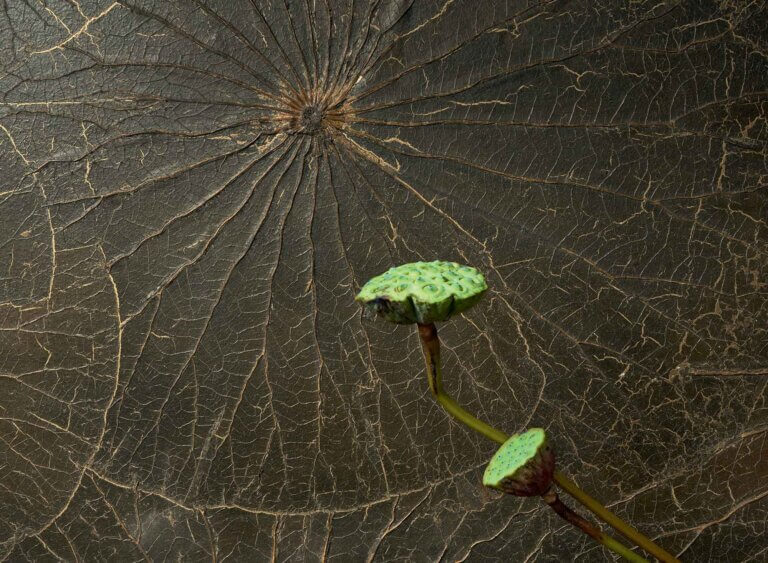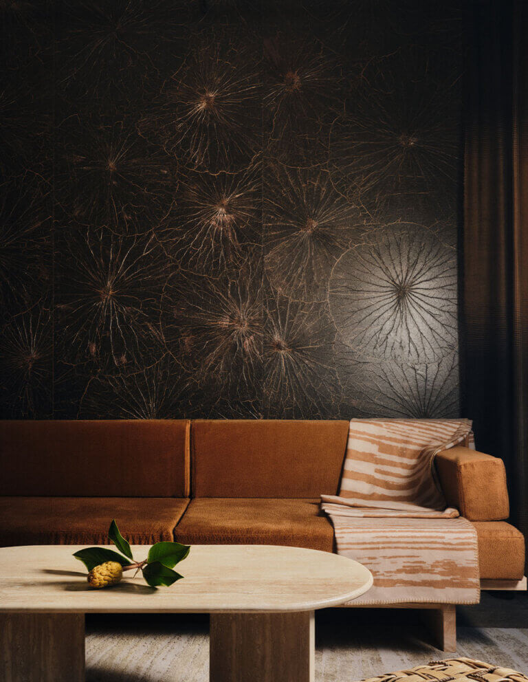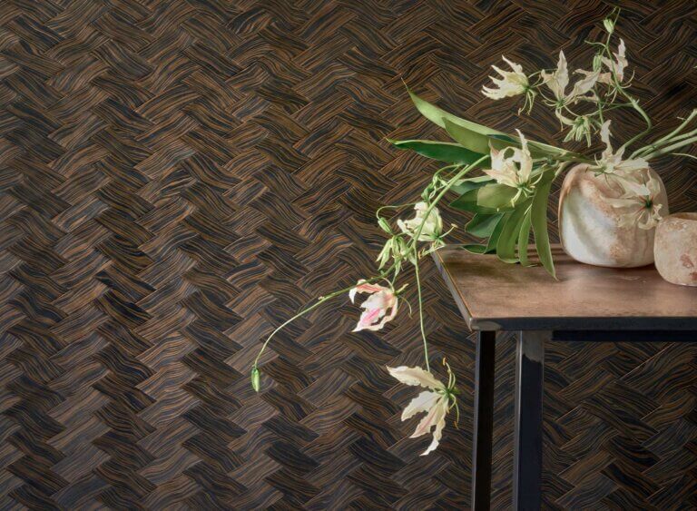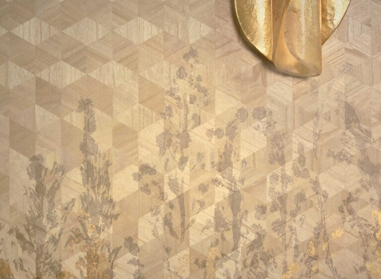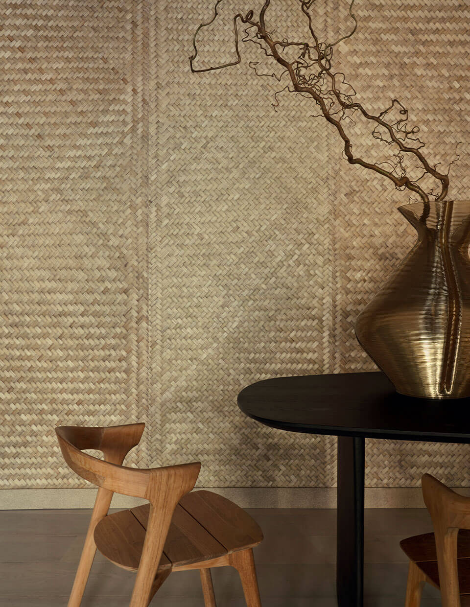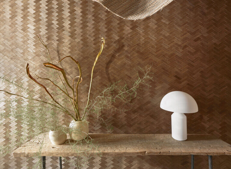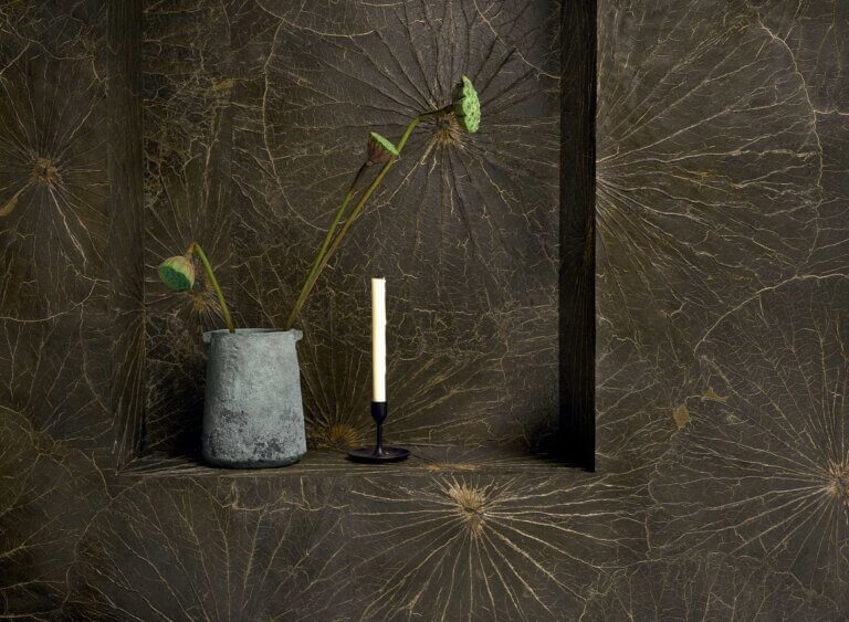 Une véritable ode à la nature. Nénuphar, maïs et bois révèlent brillamment leur préciosité dans des créations envoûtantes. Comment oublier la finesse de ces marqueteries aux teintes nuancées, parfois dégradées et métallisées, cet inouï tissage de bois et ce nénuphar en herbier ? Entièrement découpées et minutieusement assemblées ou tressées à la main, ces fibres singulières jouent une partition d’exception, une harmonie rendue possible par de vénérables savoir-faire.