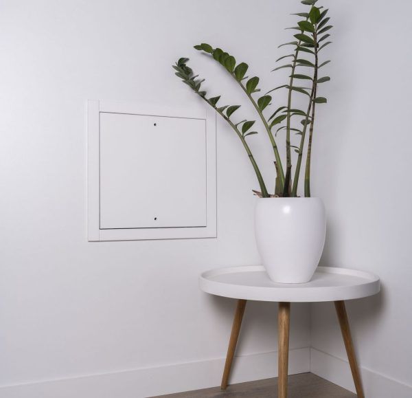 Trappe de visite verticale, avec cadre en bois de section 45x68 et portillon MDF 22 mm, verrouillage par batteuses avec carré de 6.