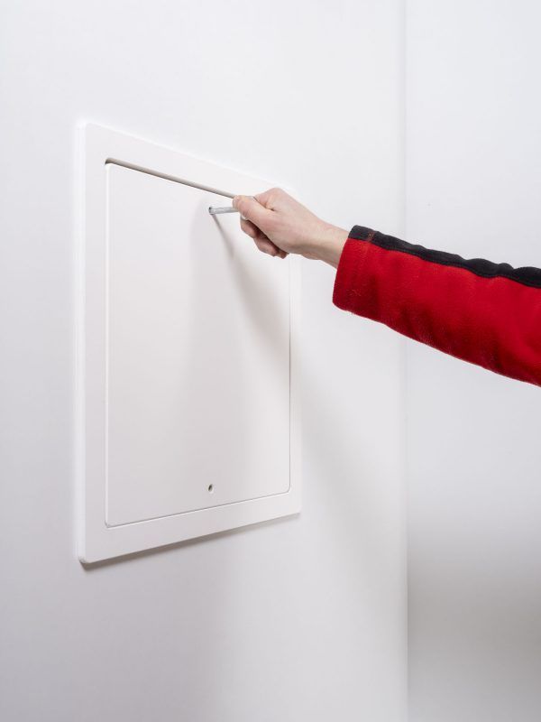 Trappe de visite verticale, avec cadre médium monobloc et portillon MDF 40 mm, verrouillage par batteuses avec carré de 6.
