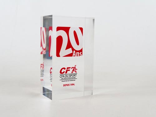 Qu'il s'agisse d'un support publicitaire, d'un trophée ou d'un tombstone, mais aussi d'un projet de PLV ou de signalétique, le processus d'inclusion dans le verre acrylique permet une réalisation sur-mesure. Grâce à notre équipe de techniciens créatifs et compétents, nous vous proposons d'élaborer pour vous un objet en plexiglas unique et durable. Pour vous démarquer de la concurrence, soutenir votre image de marque ou créer un symbole aisément identifiable, l’inclusion plexiglas représente la solution idéale.