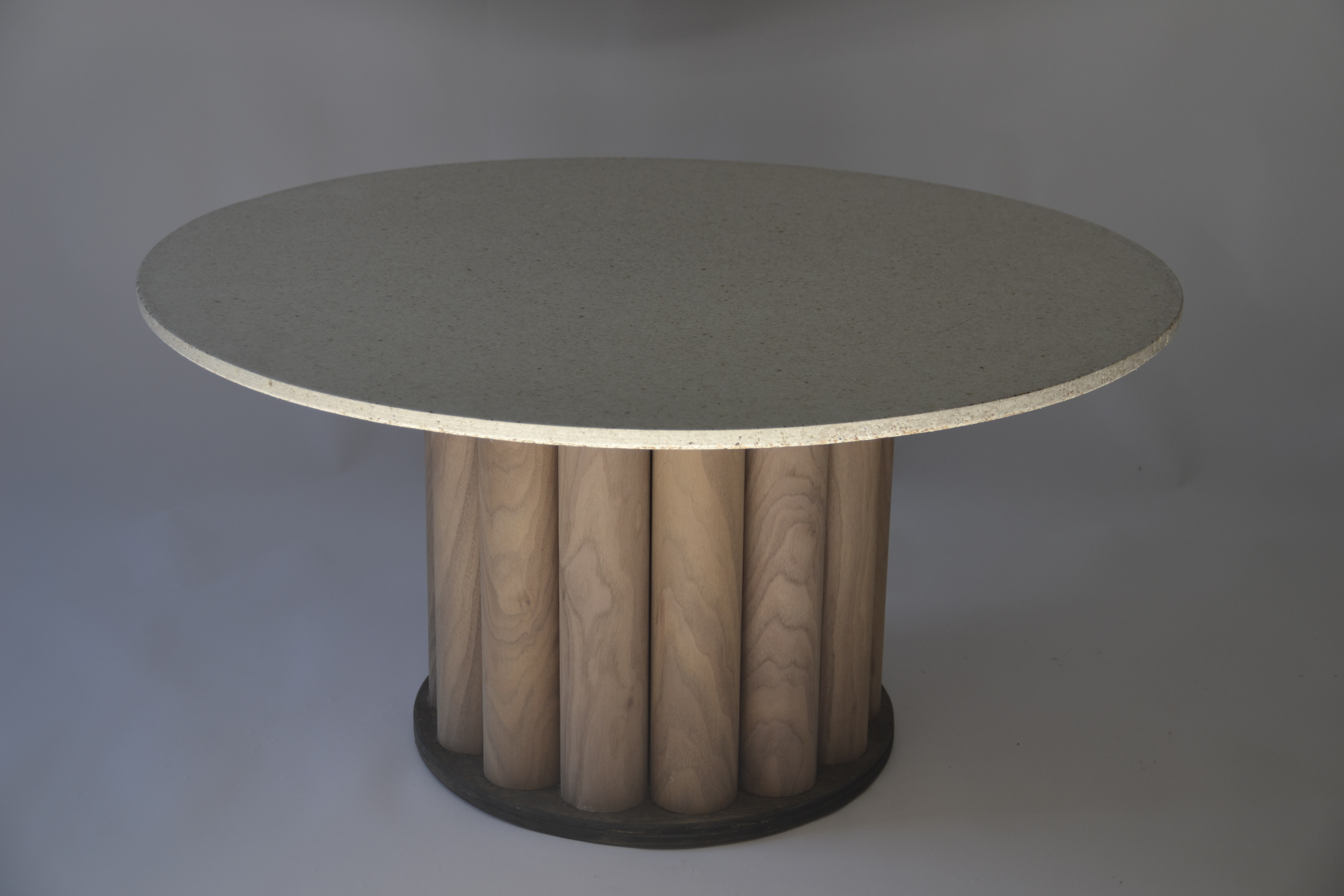 Table basse Héritage avec un pied composé de 14 tubes de volants habillés grâce à un placage noyer.