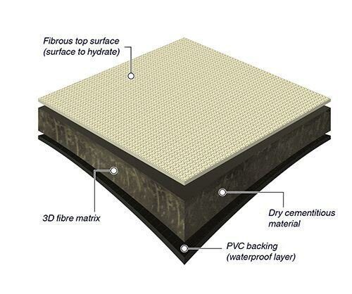 La solution de toile CC se compose d’une matrice fibrée tridimensionnelle composée d’un mélange de béton sec formulé spécialement. Un support en PVC garantit la complète étanchéité de la toile CC. La toile CC peut être hydratée par pulvérisation ou par immersion complète dans de l’eau douce ou salée. Ce après quoi les fibres renforcent le mélange cimentaire, empêchant ainsi la propagation de fissures tout en offrant un système de rupture du plastique sans danger. En conséquence, la toile CC fournit une alternative au béton traditionnel qui est mince, durable, étanche à l’eau et avec une faible teneur en carbone.